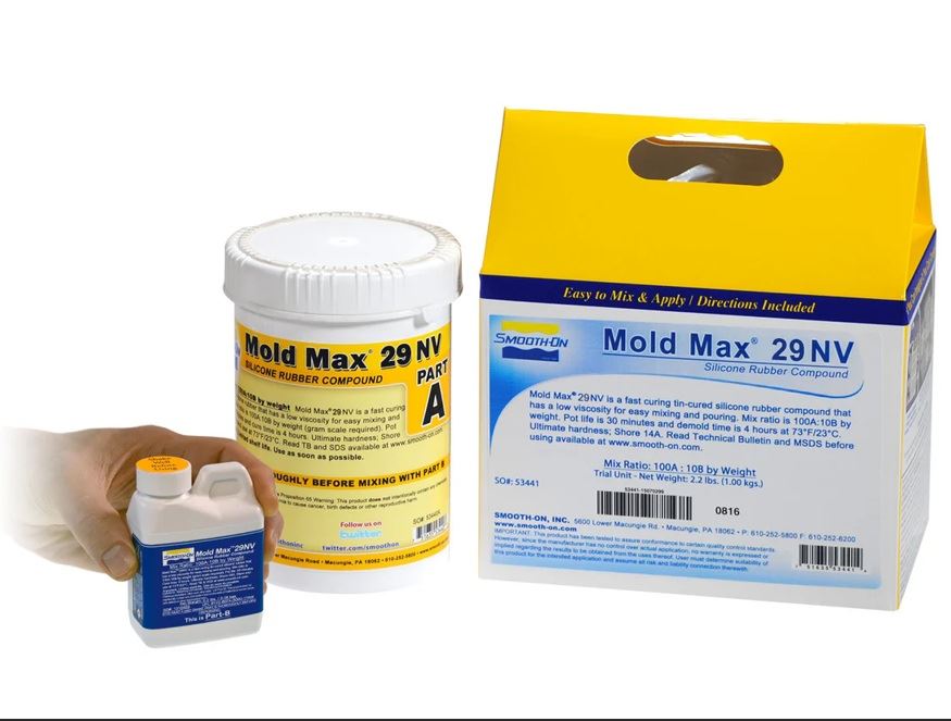 MOLD MAX 29NV סיליקון על בסיס Tin, בשור A30 בעל חוזק מכאני מצויין . יחס ערבוב: 100:10 בעל זמן עבודה של 45 דקות והתקשות אחרי 6 שעות בלבד. מולד מקס 29NV הינו סיליקון בעל צמיגות נמוכה ויודע להוציא את בועות האוויר בעצמו. אין צורך להשתמש בתא ואקום. החומר מתאים להכנת דגמים ותבניות. ניתן לצקת לתוכו וקס, גבס, ושרפים כגון, פולאיסטר, אפוקסי, פולאירויטן ועוד....