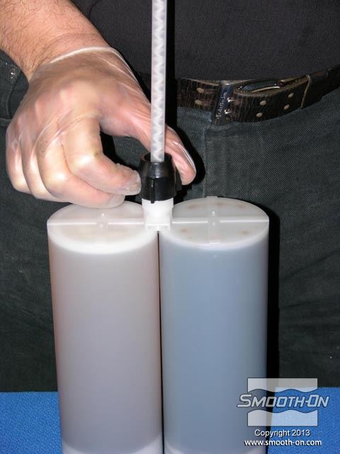 לחיצה להגדלת תמונה מחברים את המחסנית עם המיקסר הסטטי אל אקדח ההתזה EZ-Spray gun. מחברים לאקדח גם את צינור לחץ האוויר. מחברים את המחסנית עם המיקסר הסטטי אל אקדח ההתזה EZ-Spray gun. מחברים לאקדח גם את צינור לחץ האוויר.