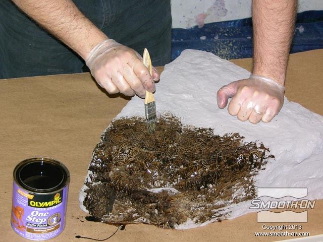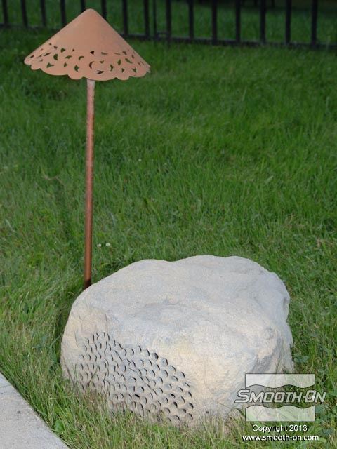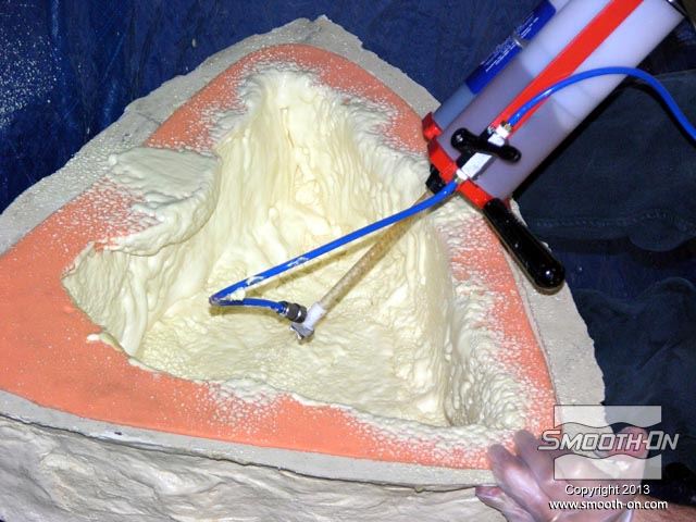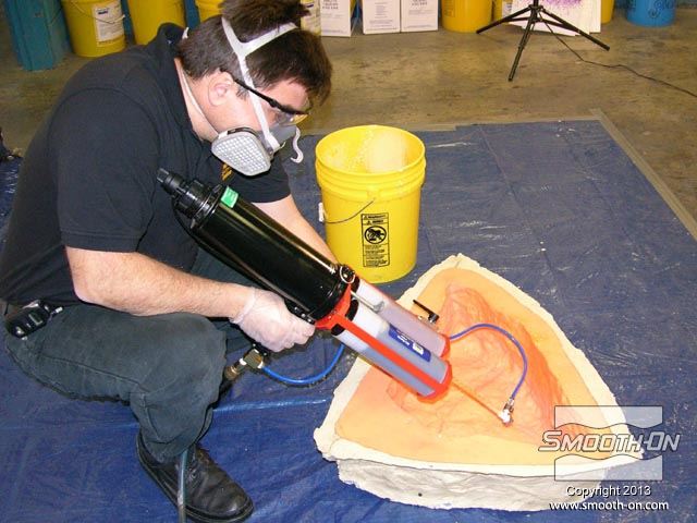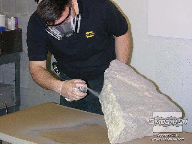 מורידים את מכסה מחסנית הEZ-Spray  ופותחים אותה. מומלץ לעבוד עם כפפות! מכניסים מייצב זרימה (כלול) לפני שמוחברים את המיקסר הסטטי. מחברים את המיקסר הסטטי (כלול) למחסנית. מחזקים את האטם בקצה צינור הערבוב. מחברים את המחסנית עם המיקסר הסטטי אל אקדח ההתזה EZ-Spray gun. מחברים לאקדח גם את צינור לחץ האוויר. מריצים את החומר באקדח ע משתמשים בתבנית של סיליקון למריחה Rebound® 25 עם מעיל תמיכה וממקמים אותה עבור ההתזה. מרססים שכבה דקה ואחידה על גבי התבנית. חשוב לבצע את הריסוס עם מסכה מאושרת לפי NIOSH. הקצף מתחיל להתפשט במהירות ויוצר מעטפת חלולה. מתיזים שכבה נוספת כדי שיתקבל חלק חזק ובעובי אחיד. מתיזים שכבה נוספת כדי שיתקבל חלק חזק ובעובי אחיד. מניחים לקצף הפוליאוריתן להתמצק לחלוטין לפי שמוציאים אותו מהתבנית. מניחים לקצף הפוליאוריתן להתמצק לחלוטין לפי שמוציאים אותו מהתבנית. יציקת הפוליאוריטן נחלצת בקלות מתבנית סיליקון למריחה Rebound® 25 היציקה מוכנה והיא העתקה מדוייקת של התבנית. ניתן לחתוך בזהירות שאריות חומר לא רצויות בעזרת סכין מתאימה. מרססים על המשטח החיצוני אמייל בצבע חום ומניחים לו להתייבש. מורחים שכבת גימור על בסיס פוליאוריתן כדי להוסיף עומק וגיוון לדגם. רמקול האבן ה היצרן מספק מספר גדלים וגימורים שונים. בחצר זו מוקמו מספר רמקולים בצורת אבן כדי לספק מערכות סאונד שאיזה פוגעת באווירה הטבעית של החצר.
