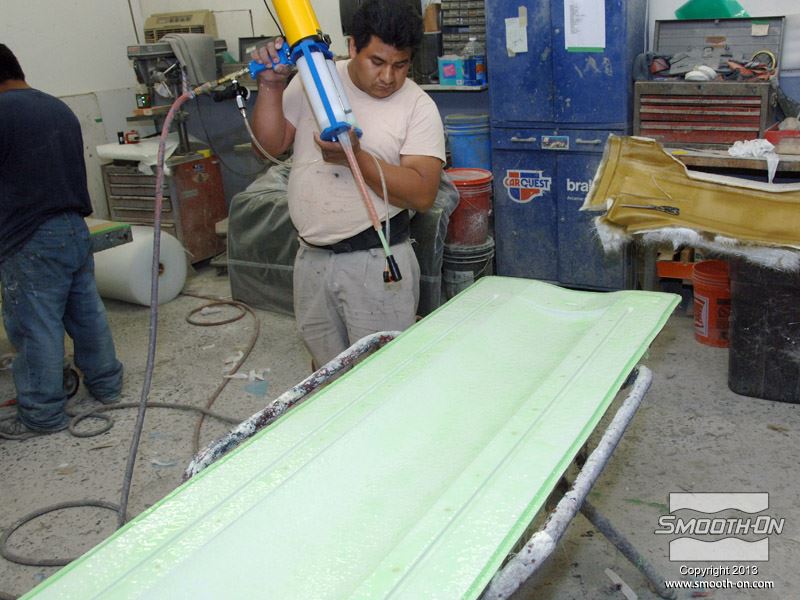 לחיצה להגדלת תמונה מרססים שכבת ג'לקוט על בסיס אפוקסי (Gel Coat) על המודל. מרססים שכבת ג'לקוט על בסיס אפוקסי (Gel Coat) על המודל.