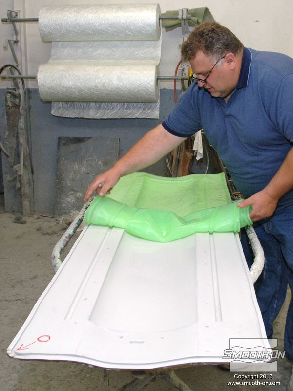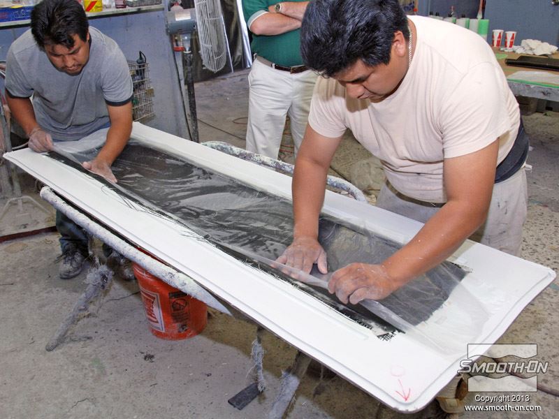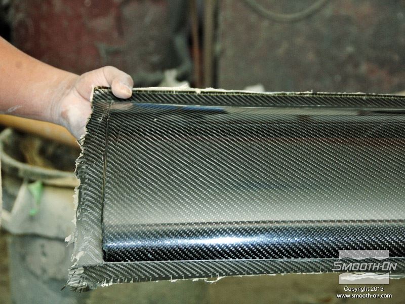 בתעשיית מכוניות הביצועים מכינים חלקים רבים מחומרים מרוכבים. בדים משריינים (בדי זכוכית, בדי קבלר וסיבי קרבון משולבים עם אפוקסי EpoxAmite כדי ליצור חלקים חזקים מאוד וקלים בשיכוב ידני מכינים את המודל המקורי עבור תהליך הכנת התבנית. המודל הינו חצי מכנף ספוילר עבור מכונית. מרססים שכבת ג'לקוט על בסיס אפוקסי (Gel Coat) על המודל. מכינים לג'לקוט תמיכה מסיבי זכוכית ספוגים בשרף אפוקסי. במקרה זה משתמשים בבד זכוכית לא ארוג. משתמשים בצינורות PVC כדי לספק תמיכה נוספת לתבנית. כך נראית התבנית הגמורה, לפני הכנת שקית הואקום. מכינים את מחסניות סיליקון להתזה EZ~Spray® Silicone 20 . מחברים את מחסנית הEZ~Spray® Silicone 20  אל אקדח להתזת סיליקון EZ~Spray® Jr. Gun. מורידים מהמיקסר הסטטי את הראש המרסס. ויוצקים את הסיליקון מסביב לתבנית כדי להכין מסגרת אטימה. לאחר שיוצרים אטימה, מחברים מחדש את הראש המרסס על גבי צינור הערבוב. כעת אפשר להתחיל לרסס את הEZ~Spray® Silicone 20. מרססים שכבה דקה של EZ~Spray® Silicone 20 על גבי התבנית באופן אחיד. מרססים עוד סיליקון להתזה EZ~Spray® Silicone 20 על גבי התבנית ומעבים את שכבת הסיליקון באופן אחיד. מניחים חתיכה קטנה של אריג תמיכה על גבי הסיליקון כשהוא במצב דביק Tacky כדי לחזק את האזור שבו יהיה המחבר לפיית הואקום. מרססים עוד EZ~Spray® Silicone 20 על גבי התבנית כולל על אריג התמיכה. סיליקון EZ~Spray® Silicone 20 הוא חזק במיוחד ועמיד בקריעה גם בעוביים קטנים. שקית הוואקום הגמורה הינה בעובי של כ-6.4mm. מציירים חץ אדום על התבנית ועל שקית הוואקום כדי שיהיה קל לזהות את מיקומה הנכון בעת הצבתה מחדש. גוללים את שקית הואקום מעל גבי התבנית. הסיליקון הוא גמיש וישמור על צורתו. עושים חתך קטן בחתיכת האריג ומכניסים את המחבר לצינור הואקום. שקית הואקום עם החיבור לואקום מוכנים. מורחים חומר הפרדה על פני התבנית. לפני הכנת החלק יש גם לנקות ולהבריק את התבנית. כך גימור החלק יהיה מבריק ביותר. גוזרים את בדי הפחם לגודל הרצוי. מניחים שכבה אחת של בד הפחם על התבנית. בהכנת החלק הזה השתמשו באפוקסי EpoxAmite , ניתן להשתמש באפוקסי CR-80 של חברת סיקה גרמניה. חומרים אלו הם בעלי צמיגות נמוכה ומסוגל להספיג בקלות סוגים רבים של אריגים וסיבים. ממקמים את בד הפחם בתבנית. מודדים את החומרים בעזרת משאבות מכויילות מראש. לחיצה אחת על המשאבה מחלק A היא הכמות הנכונה עבור לחיצה אחת מהמשאבה של חלק B. מודדים לכוס את חלק B. מערבבים ביסודיות את שני החלקים. חשוב לגרד את צידי מיכל הערבוב ואת התחתית מספר פעמים כדי לוודא ערבוב טוב. שופכים את האפוקסי להספגה הEpoxAmite על משטח בדי הפחם. יש להשתמש במספיק חומר כדי להרטיב ולהספיג כראוי את כל הבד. מורחים אפוקסי להספגה EpoxAmite בעזרת מברשות ורולרים. האפוקסי מרטיב בקלות את בד סיבי הפחמן. מניחים שכבות נוספות של בד קרבון בין השכבות מורחים שכבה נוספת של אפוקסי להספגה EpoxAmine בכל פעם. מניחים על בד הקרבון המסופג בד קילוף Peel ply. לאחר מכן, מניחים ניילון מחורר מניחים מחדש את שקית הוואקום. מסדרים את מסגרת האטימה מהסיליקון על התבנית כדי לוודא אטימה מלאה ומיקום נכון של השקית. מחברים את צינור הואקום לחיבור בשקית הסיליקון. משאבת הואקום צריכה להיות מסוגלת למשוך 29 אינטש כספית ( 0.973Bar). הואקום לוחץ על החלק ומוציא ממנו את בועות האוויר שנקלעו במהלך ההספגה. התבנית נשארת תחת הלחץ של הואקוםעל מנת לשחרר את כל האוויר מהחלק.  נותנים לאפוקסי להתמצק תוך כדי הפעלת הואקום כדי למנוע פגמים בחלק. לאחר ש אפוקסי להספגה EpoxAmide התמצק לחלוטין ניתן להסיר את שקית הEZ~Spray. גוללים את שקית הואקום מעל גבי התבנית. לאחר מכן ניתן לאחסן אותה עד לשימוש הבא. מורידים את בד הקילוף ואת הניילון המחורר מהחלק. מוציאים בעדינות את החלק מהתבנית. מוציאים בעדינות את החלק מהתבנית. הצורה הגאומטרית של התבנית הועתקה במדוייק לחלק מסיבי הפחמן. ל אפוקסי להספגה EpoxAmite (לאחר התמצקות מוחלטת) יש תכונות פיסיקאליות מצויינות וביצועים מעולים. ניתן לשייף, לעצב, לחרוט, ל