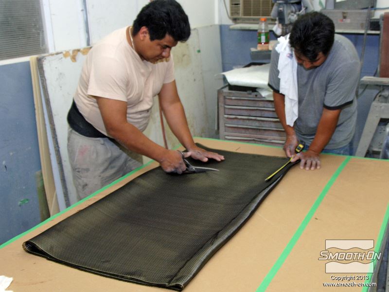 לחיצה להגדלת תמונה מניחים שכבות נוספות של בד קרבון בין השכבות מורחים שכבה נוספת של אפוקסי להספגה EpoxAmine בכל פעם. מניחים שכבות נוספות של בד קרבון בין השכבות מורחים שכבה נוספת של אפוקסי להספגה EpoxAmine בכל פעם.