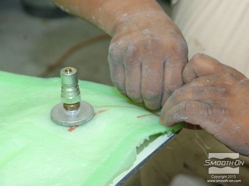 לחיצה להגדלת תמונה מניחים חתיכה קטנה של אריג תמיכה על גבי הסיליקון כשהוא במצב דביק Tacky כדי לחזק את האזור שבו יהיה המחבר לפיית הואקום. מניחים חתיכה קטנה של אריג תמיכה על גבי הסיליקון כשהוא במצב דביק Tacky כדי לחזק את האזור שבו יהיה המחבר לפיית הואקום.