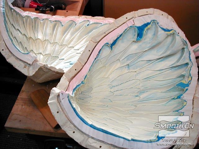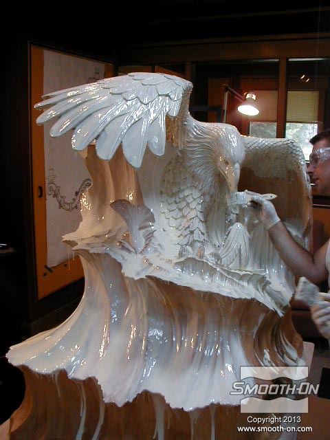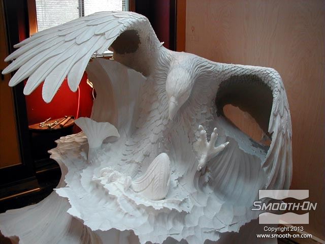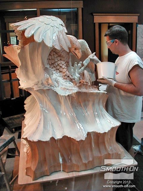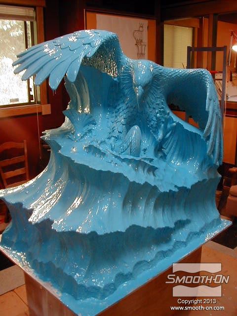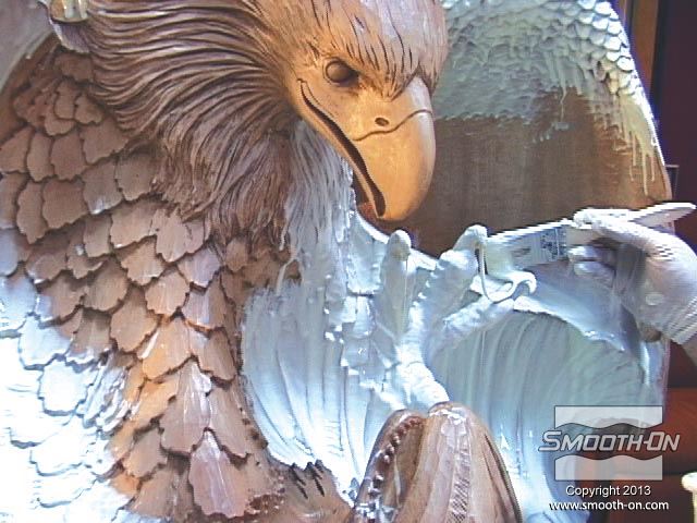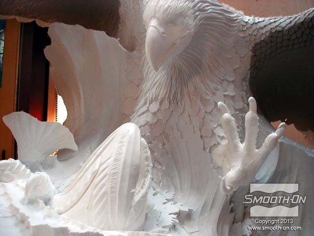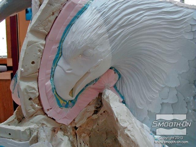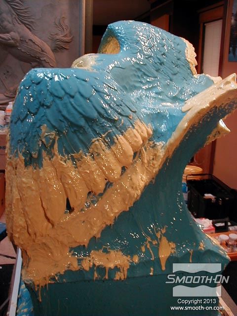 פסל העץ המקורי של דניס קולייר. מורחים שכבה ראשונה של סיליקון רך Mold Max® 10 להכנת תבנית. מכסים את כל שטח מודל העץ בשכבה דקה מאוד של סיליקון רך ליציקה Mold Max® 10. מבט נוסף על שכבת ה סיליקון Mold Max® 10  הראשונה. שכבה זו חשובה במיוחדת ונקראת מורחים שכבה שניה של סיליקון Mold Max® 10. צובעים שכבה זו בפיגמנט לסיליקון SilcPig כדי להבטיח כיסוי טוב. שכבת הסיליקון Mold Max® 10  השניה מוכנה. מורחים שכבה שלישית של סיליקון RTV לתבניות Mold Max® 10. מוסיפים לשכבה הרביעית של הסיליקון Mold Max® 10  פיגמנט לסיליקון SilcPig ומסמיך לסיליקון   Thi-Vex II. מורחים שכבה זו כדי להוסיף תמיכה לתבנית הסיליקון ולמלא זוויות שליליות (אנדרקאטים). לאחר שבונים לתבנית הסיליקון Mold Max® 10  את מעיל התמיכה (בעל מספר חלקים) מפוליאוריתן קשיח למריחה Plasti-Paste® II, ממקמים אותה במכונה ליציקה ברוטציה (Rotational Molding). מטים את התבנית במכונת הרוטציה כך שניתן יהיה יצוק אליה את שרף היציקה. שופכים שרף פוליאוריתן ליציקה ברוטציה  Smooth Cast Roto®. מורחים את הפוליאוריטן Smooth Cast 65D®  הנוזלי במברשת במקומות בהם קיימים פרטים עמוקים. מטים את התבנית במכונת רוטציה כך שהפוליאוריתן הנוזלי יגיע לכל האזורים בתבנית. חוזרים על התהליך מספר פעמים עד שמתקבלת מעטפת יציבה ועבה מספיק של פלסטיק (Skin) על גבי פנים התבנית. לאחר שפוליאוריתן ליציקה בסיבוב  Smooth Cast Roto®  מתמצק לחלוטין, מורידים את מעיל התמיכה. בתמונה זו, בה הסירו רק את חלקי מעיל התמיכה של חצי מתחתית המודל והחצאים העליונים של הכנפיים, ממחישה עד כמה תבנית זו מסובכת. מסירים את מעיל התמיכה מחצי אחד של ראש הנשר. מסירים את מעיל התמיכה מחצי ראש הנשר וחושפים את היציקה. היציקה העתיקה במדוייק את כל פרטי פסל העץ המקורי. מבט מקרוב על החצי השמאלי של ראש הנשר בתבנית סיליקון RTV   . תמונה זו ממחישה אילו פרטים קטנים מסוגל סיליקון Mold Max® 10 להעתיק. השוקעה מחשבה רבה בהכנת מעיל התמיכה. בנו אותו ממספר רב של חלקים כדי להתמודד עם אנדרקאטים ו'נעילה' של המעיל. בתמונה זו ניתן לראות את היציקה כשהיא בתוך תבנית הגומי סיליקון Mold-Max ומעיל התמיכה מפוליאוריתן Plasti-Paste II. כאן ניתן לראות את הפרטים שעל הכנף. אפילו התבנית של הכנף היא מעניינת! מבט על - בתמונה זו ניתן לראות איך החצי התחתון של הכנף מתחבר עם צד הנשר. במקרה זה היה צריך גם להכין מבט על פקק הסיליקון, לאחר שהסירו ממנו את מעיל התמיכה הפנימי שלו. יציקת הפוליאוריתן Smooth Cast® 65D הגמורה היא חלולה אך חזקה ושוקלת אחוז קטן ממה שהייתה שוקל יציקת ברונזה, גבס ואפילו פסל העץ המקורי. מבט מבקרוב על יציקת הפוליאוריתן הקשיח Smooth Cast® 65D. הלקוח שהזמין את העבודה הזמין גם גרסת ברונזה של הפסל. את מודל השעווה שעליו יצקו את הברונזה הכינו באותה תבנית. מבט מקרוב על יציקת הברונזה. ניתן לראות שהיציקה העתיקה את כל פרטי המודל המקורי.