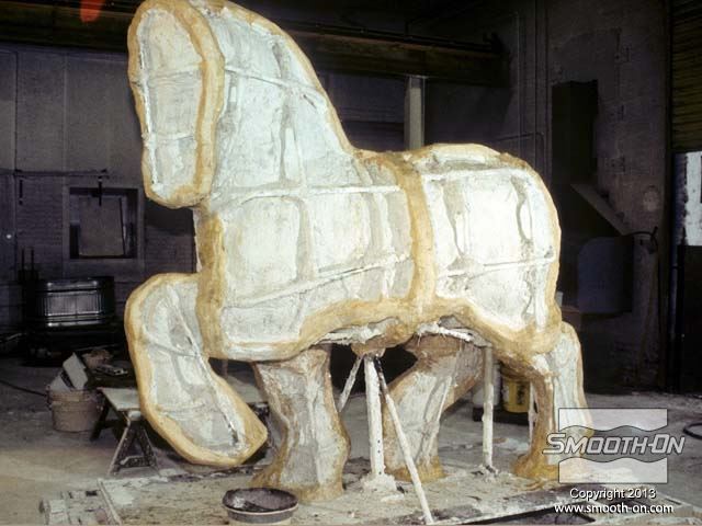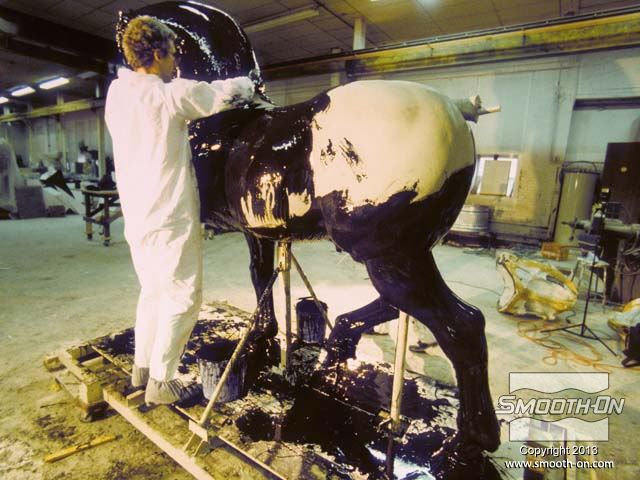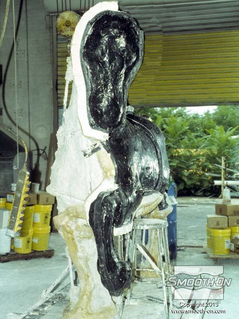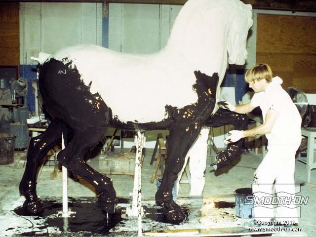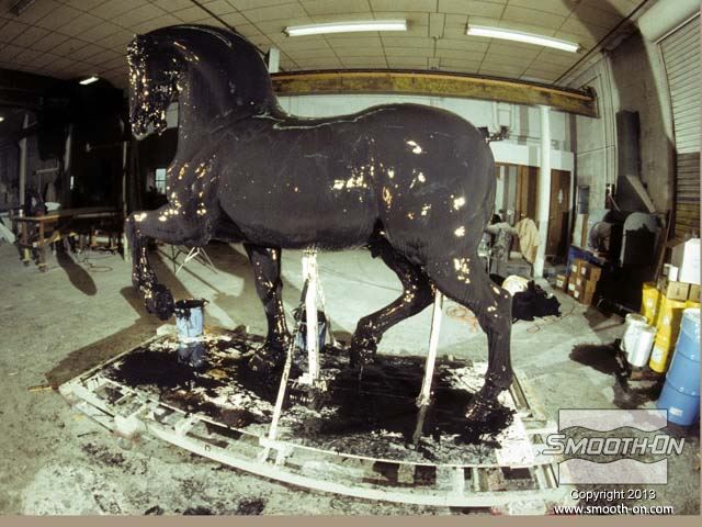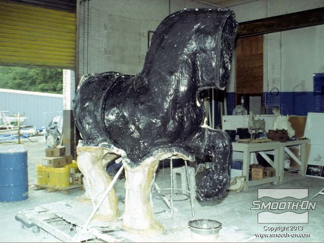 מודל הסוס פוסל מחימר Roma Plastillina המכיל חימר. לפוליסולפיד אין בעיה עם חימר המכיל גופרית בשונה מפוליאוריתן. שוקלים את הבסיס של ה פוליסולפיד. יחס הערבוב הוא 100A:12B לפי משקל. שוקלים גם את מקשה של ה פוליסולפיד FMC®-200. מערבבים את הבסיס והמקשה ביסודיות. מורחים על המודל את השכבת הראשונה של הפוליסולפיד FMC®-200 (שכבת הפרטים). גומי פוליסולפיד הוא קל ונוח למריחה. מקפידים למלא את כל הפרטים העמוקים במודל בגומי פוליסולפיד FMC®-200, במקרה זה במיוחד ברעמת הסוס. מורחים את הפוליסולפיד FMC®-200 על כל משטחי המודל ומכסים אותו לגמרי. הגומי נמרח בקלות ונוח לעבודה. מניחים לשכבה הראשונה להפוך לדביקה (Tacky) לפני שמורחים שכבה נוספת. מורחים עוד 3 שכבות של גומי פוליסולפיד FMC®-200 כאשר מחכים שכל שכבה תהפוך לדביקה לפני שמורחים את השכבה הבאה. בין השכבה השלישית לרביעית מפסלים קווי הפרדה מגומי עבור חלקי מעיל התמיכה השונים. מכינים בעדינות מעיל תמיכה מגבס עבור תבנית הגומי פוליסולפיד FMC®-200. יש לתכנן ולבנות את מעיל התמיכה כך שלא תיווצר נעילה מכאנית בין חלקיו השונים! לאחר שמרכיבים את כל מעיל התמיכה על גוף הסוס, בונים את מעיל התמיכה של הראש. לאחר שמעיל התמיכה מגבס הושלם, מחכים שכל החומרים יתמצקו לגמרי ואז תבנית ה פוליסולפיד FMC®-200 מוכנה ליציקה.