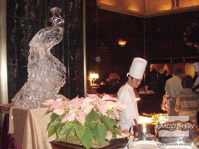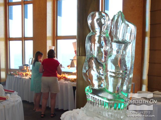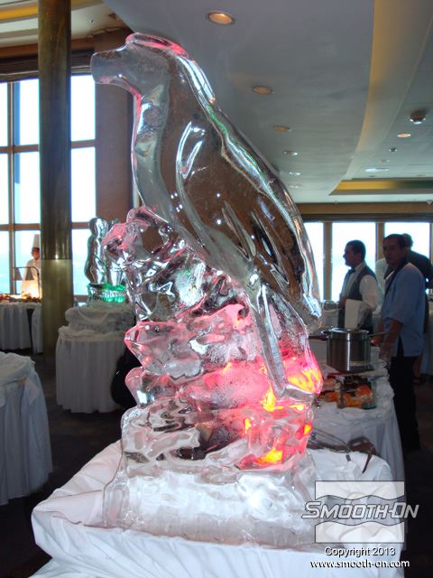 תהליך יצירת פסל הקרח של ארנסטו מתחיל בפיסול המודל המקורי מ חימר מעצבים. ארנסטו משתמש בחימר מעצבים Chavant NSP, נטול גופרית, שלא יפריע לסיליקון למריחה Rebound 25. כשהפסל מוכן, ארנסטו מתחיל להכין את התבנית בעזרת סיליקון למריחה Rebound 25. ארנסטו מכין תבניות כבר 25 שנה והוא אומר ש לאחר ש הסיליקון לתבניות Rebound® 25 התמצק לגמרי, מכינים מעיל תמיכה מפוליאוריתן למריחה Plasti-Patse. לאחר שמעיל התמיכה מתמצק, מוציאים את מודל ה חימר לעיצוב המקורי. לאחר מכן, מחזירים את תבנית הסיליקון אל מעיל התמיכה ונועלים את החצאים. תבנית ה גומי סיליקון Rebound® 25 מוכנה ליציקת המים. כדי לחסוך באנרגיה וכסף, ארנסטו מעביר הרבה מהייצור שלו החוצה בחודשי החורף הקרים ונותר לטבע לעשות את שלו ולהכין את פסלי הקרח היפים. מילוי תבנית הסיליקון אורך פחות מדקה. מניחים למים לקפוא בתבנית. לאחר מספר ימים, פסל הקרח מוכן לחליצה. דרושים לפחות שני אנשים כדי להרים את התבנית והיציקה הכבדות. פותחים את הנעילה במעיל התמיכה. מסירים את שני חצאי מעיל התמיכה, אחד אחרי השני. מסירים את שני חצאי מעיל התמיכה, אחד אחרי השני. מסירים את תבנית סיליקון Rebound® 25 מהפסל, כמו כפפה. סיליקון למריחה Rebound® 25 הוא חומר חזק מאוד וניתן לבצע בו מאות יציקות. פסל הקרח מוכן. הוא מוסיף עניין ואווירה אלגנטית לכל סביבה. ארנסטו הכין פסלים שהוצגו במסיבות פרטיות, אירועים של הממשלה ושל קבוצות ספורט, קאנטרי קלאבים ועוד. הטווס בעל הפרטים המרשמים בתמונה הוא הפסל נמכר ביותר עבור החברה של ארנסטו How Nice Ice. פסל זה של קרן השפע (קורנוקופיה) הוא בגובה 1.22 מטר. ארנסטו אומר ש פסלי הקרח של ארנסטו על סיפון הQE II. הפסלים מוסיפים מגע אלגנטי למסעדה. פסלי הקרח של ארנסטו על סיפון הQE II. הפסלים מוסיפים מגע אלגנטי למסעדה. ארנסטו אומר ש עיצוב פסל מיוחד שארנסטו הכין בשביל לשמור בקבוקים בקירור על סיפון הQE II.