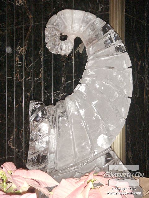 לחיצה להגדלת תמונה פסל זה של קרן השפע (קורנוקופיה) הוא בגובה 1.22 מטר. ארנסטו אומר ש פסל זה של קרן השפע (קורנוקופיה) הוא בגובה 1.22 מטר. ארנסטו אומר ש"המחירים של תהליך הכנת התבנית מכוסים במהירות על ידי מכירת מספר קטן של פסלים. עלויות העבודה של יציקות המים לעומת הפיסול בקרח עצמו הן מזעריות ומחיר חומר העבודה הגולמי? רק מים".
