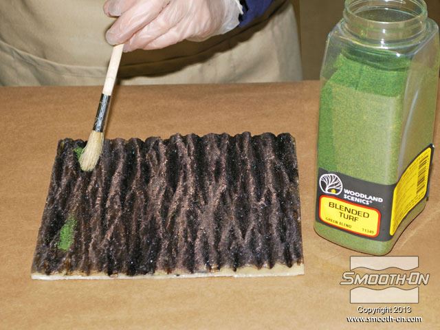 לחיצה להגדלת תמונה מוסיפים מעט דשא מעורבב עם דבק כדי לדמות מראה של טחב על קליפת העץ. מוסיפים מעט דשא מעורבב עם דבק כדי לדמות מראה של טחב על קליפת העץ.