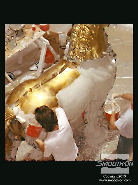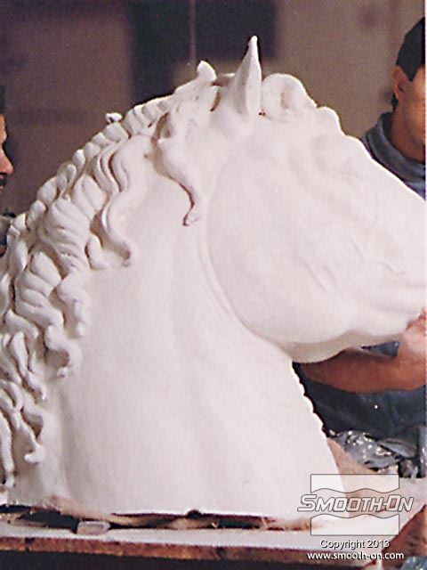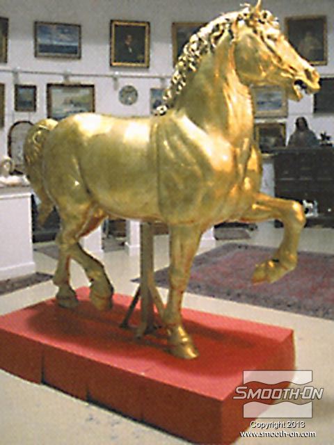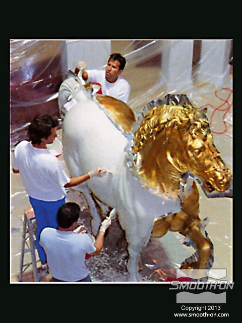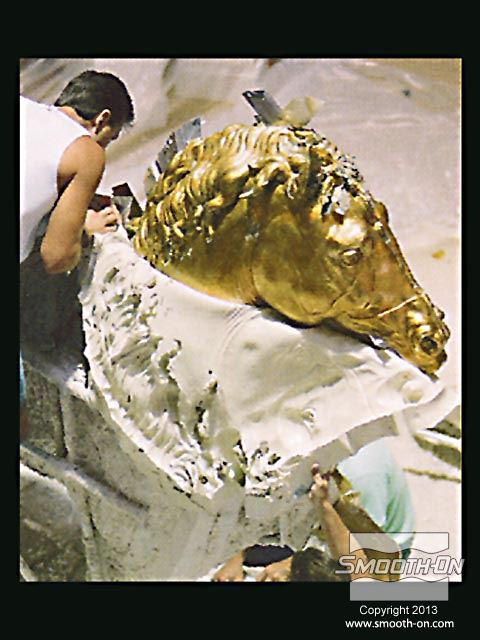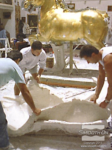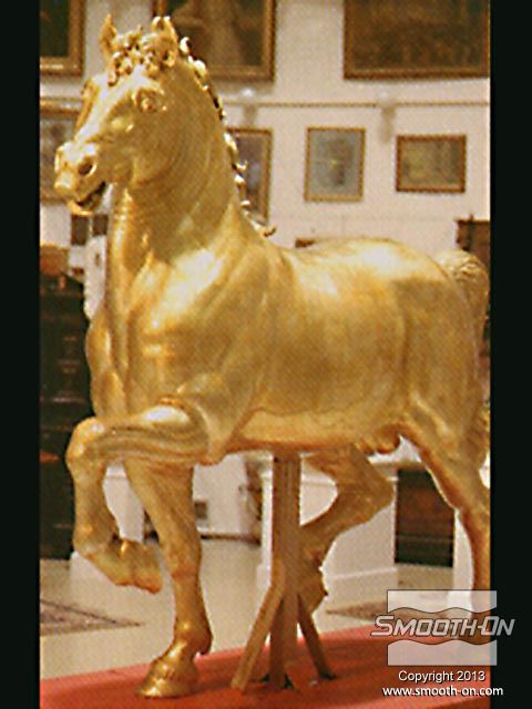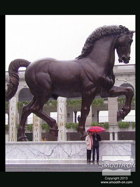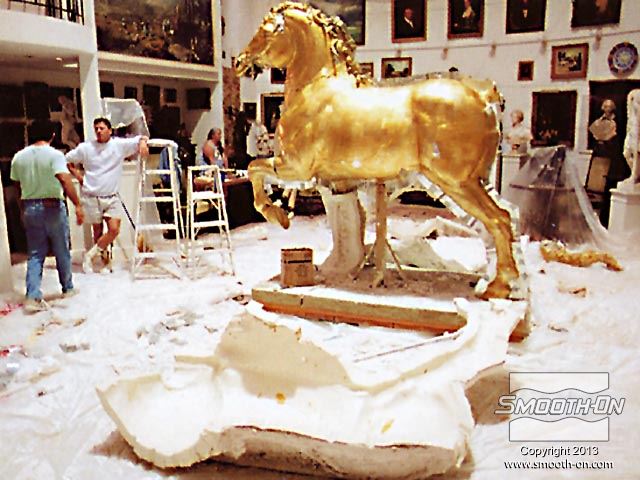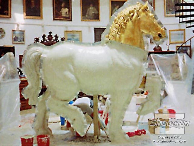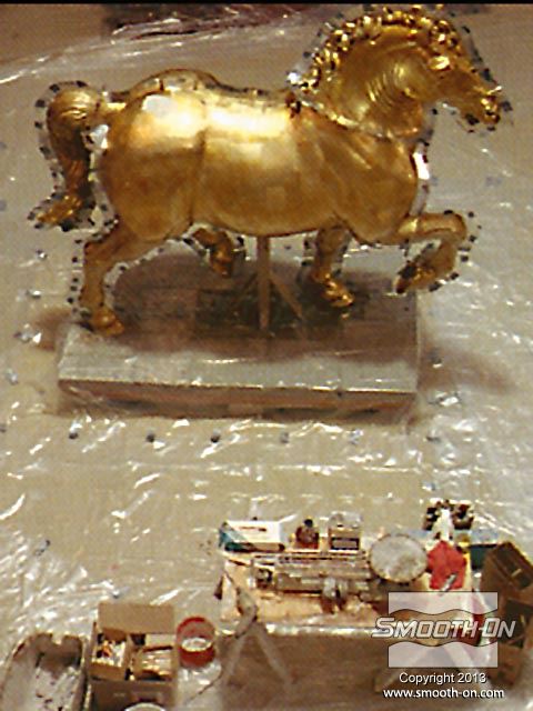 אמנים מחברת Clifton Sheely Co מתחילים את ההכנות להכנת תבנית. הם מכינים את מודל הסוס הזהוב לתהליך ע לאחר מכן, אוטמים את המדל עם חומר שלאק (Shellac) ומרססים עליו חומר הפרדה. מודדים ומערבבים את הגומי למריחה Brush on 40 של חברת Smooth-On. מערבבים ומורחים את הפוליאוריתן למריחה . מוסיפים לגומי חומר מסמיך URE FILL 11 וכך הוא נעשה זמין למריחה. היכלות לשלוט בצמיגות החומר בקלות ובמדוייק היא רק אחת הסיבות שמיצרי תבניות בכל העולם בוחרים במוצרי האיכות של חברת Smooth-On. מורחים 5 שכבות של הגומי של Smooth-On כדי להעניק לתבנית חוזק. לאחר שתבנית הגומי מתמצקת לחלוטין, מכינים מעיל תמיכה מגבס בכמה שכבות. לאחר שמעיל התמיכה מהגבס מתמצק, מסירים אותו בחלקים שהוגדרו על פי המחיצות שהכינו מוקדם יותר. מסירים את תבנית הגומי מהמודל. ניתן לראות שכל הפרטים המורכבים במודל הועתקו לתבנית הגומי של Smooth-On. מסדרים את חלקי תבנית הגומי בחלקי מעיל התמיכה. יש התאמה מצויינת בין חלקי התבנית לחלקי המעיל. כעת הצוות נח לאחר ימים של עבודה. חליצה של יציקת גבס של ראש הפסל, מפרידים ומורידים את שני חצאי מעיל התמיכה. מפרידים את תבנית הגומי ממעיל התמיכה. הראש הוא העתק מדוייק של המודל המקורי. תאורה חזקה מבליטה את רמת הפרטים המרשימה שהועתקו ע תאורה חזקה מבליטה את רמת הפרטים המרשימה שהועתקו ע יציקת הברונזה הגמורה הגיעה למילאן, איטליה בסתיו 1999 ונמצאת מאז במרכז לרכיבה על סוסים - 500 שנה לאחר שליאונרדו דה וינצ'י הציג את המודל שלו לדוכס העיר.