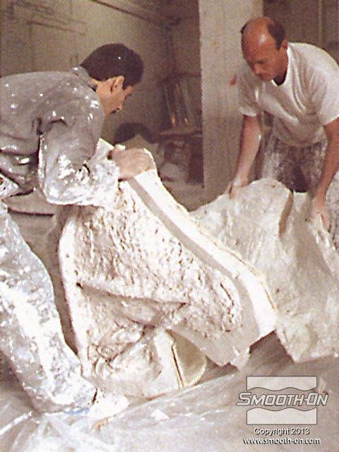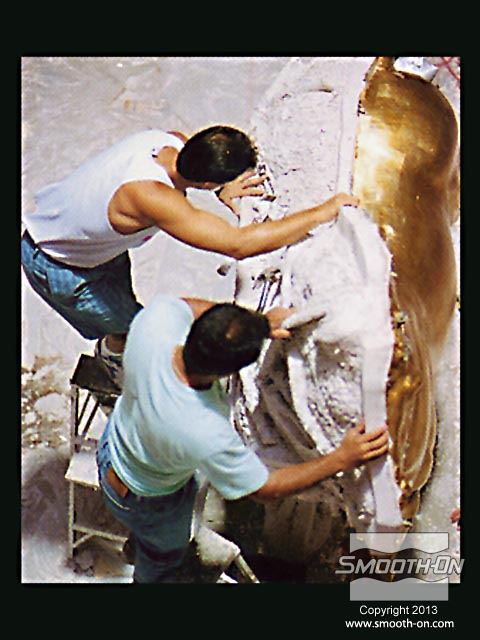 לחיצה להגדלת תמונה לאחר שתבנית הגומי מתמצקת לחלוטין, מכינים מעיל תמיכה מגבס בכמה שכבות. לאחר שמעיל התמיכה מהגבס מתמצק, מסירים אותו בחלקים שהוגדרו על פי המחיצות שהכינו מוקדם יותר. לאחר שתבנית הגומי מתמצקת לחלוטין, מכינים מעיל תמיכה מגבס בכמה שכבות. לאחר שמעיל התמיכה מהגבס מתמצק, מסירים אותו בחלקים שהוגדרו על פי המחיצות שהכינו מוקדם יותר.