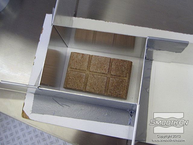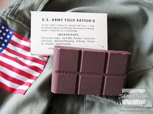 המודל המקורי במקרה זה עשוי מעץ מגולף מצופה בספריי אקריליק שקוף. יוצרים מסגרת לתבנית מלוחות מתכת דקים. יחס הערבוב של סיליקון ליציקה Smooth-Sil 940 הוא 100A:10B לפי משקל. שוקלים את חלק הבסיס של הסיליקון. שוקלים גם את המקשה של הסיליקון Smooth-Sil. מערבבים את שני המרכיבים. לאחר שמתקבלת תערובת אחידה החומר מוכן להכנסה לתא ואקום. מכניסים את הסיליקון בטוח לשימוש עם מזון Smooth-Sil 940 לתא ואקום. מגיעים לואקום של 29 אינץ' כספית (psi 14.25) בעזרת משאבה. תא הואקום משחרר את בועות האוויר הלכודות בסיליקון. שופכים את ה סיליקון ליציקה Smooth-Sil 940 בזרם דק אל קופסת התבנית. מניחים ל סיליקון למזון Smooth-Sil 940 לזרום על גבי המודל המקורי ולכסות אותו לגמרי. מניחים לסיליקון Smooth-Sil 940 להתמצק במשך 24 שעות. לאחר ההתקשות שים 4 שעות ב 100 מעלות על מנת לסיים את ההתפלמרות של החומר, שטיפה ונקיון, מכינים שוקולוד ליציקה אל תבנית ה סיליקון למגע עם מזון Smooth-Sil 940. שוברים את השוקולד לחתיכות קטנות וממיסים אותו באמבט מים ( שופכים לאט את השוקולד המותך אל תבנית ה סיליקון למזון Smooth-Sil 940. שמים את התבנית במקרר עד שהשוקולד מתמצק ומתקרר. חטיף השוקולד היצוק הוא העתק מושלם של החטיף ממלחמת העולם השניה!