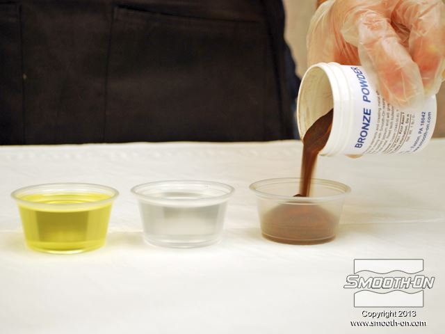 לחיצה להגדלת תמונה מערבבים את הפוליאוריטן קשיח ליציקה הSmooth-Cast® 325, פיגמנט שחור SO-Strong ואבקת ברונזה כדי להכין מערבבים את הפוליאוריטן קשיח ליציקה הSmooth-Cast® 325, פיגמנט שחור SO-Strong ואבקת ברונזה כדי להכין "יציקה קרה" של ברונזה. ניתן להשתמש גם בכל אבקת מתכת אחרת (המותאמת עבור 325) עבור תהליך זה.