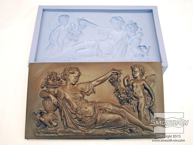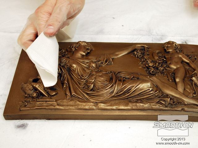 מערבבים את הפוליאוריטן קשיח ליציקה הSmooth-Cast® 325, פיגמנט שחור SO-Strong ואבקת ברונזה כדי להכין מכינים את התבנית עבור חלק זה מסיליקון גומי OOMOO® 30. כדי להבטיח חליצה קלה של היציקה מהתבנית משתמשים בחומר הפרדה לתבנית סיליקון  Ease Release® 200 . שימוש בחומר הפרדה גם מעלה את אורך החיים של תבנית הסיליקון. מרססים שכבה דקה של חומר ההפרדה Mann Ease Release® 200 על התבנית. בעזרת מברשת, מורחים חומר הפרדה בפינות התבנית ולאחר מכן מרססים בפינות עוד שכבה דקה. מנערים ומערבבים את חלק A ואת חלק B לפני שמערבבים ביניהם. מנערים ומערבבים את חלק A ואת חלק B לפני שמערבבים ביניהם. שופכים את הכמות הרצויה של בסיס הSmooth-Cast® 325 אל מיכל ערבוב. שופכים כמות שווה של מקשה הSmooth-Cast® 325 אל המיכל. אבקות המתכת של Smooth-On הן בעובי של -325 mesh (דקות מאוד) ולכן מתערבבות בקלות עם שרף פוליאוריטן ה Smooth-Cast® 325. מכניסים כמות שווה לפי נפח של אבקת ברונזה. כמויות שוות של בסיס A, מקשה B ואבקת הברונזה מוכנות לערבוב. מוסיפים שתי טיפות של פיגמנט שחור למקשה B של הפוליאוריתן. מערבבים את הפיגמנט עם חלק B עד שמתקבל גוון אחיד, לפי שמערבבים אותו עם חלק A. שופכים את הבסיס למיכל ערבוב נקי. מוסיפים את המקשה הצבוע אל הבסיס. מערבבים את הבסיס והמקשה במשך 15 שניות. מפזרים את אבקת הברונזה על השרף ומערבבים את כל הרכיבים במשך 30 שניות. בזמן הערבוב חשוב לגרד את תחתית וצידי המיכל מפעם לפעם כדי למנוע מאבקת המתכת לשקוע ולוודא ערבוב אידיאלי. שופכים את התערובת אל חלל התבנית. מוודאים שלא נותרה אבקת הברונזה בכלי. מיד מתחילים למרוח את החומר בתבנית ויוצרים התערובת תמשיך להתעבות בזמן המריחה. ברגע שהחומר מתחיל להיות דביק Tacky מפסיקים למרוח. בשלב זה, יותר מדי מריחה עלולה לפגוע ביציקה. לאחר שמפסיקים למרוח את הג'לקוט מניחים לו למשך 5-10 דקות כדי שיעבור התמצקות חלקית. חשוב שהחומר לא יתמצק לחלוטין בשלב זה, אחרת עלולה להתרחש דהלמינציה בין הג'לקוט ושכבת מילוי. שכבת המילוי: מודדים כמויות שוות של הבסיס והמקשה של הSmooth-Cast® 325, לפי נפח. שכבת המילוי: מודדים כמויות שוות של הבסיס והמקשה של הSmooth-Cast® 325, לפי נפח. משתמשים בצבע SO-Strong חום כדי ששכבה זו תשתלב עם הבסיס בצבע הברונזה. מוסיפים מספר טיפות של הצבען לחלק B ומערבבים. לפני הערבוב על חלק A, יש לוודא שהצבען וחלק B מעורבבים היטב. שופכים את חלק הבסיס של פוליאוריתן  הSmooth-Cast® 325 למיכל הערבוב. שופכים אל המיכל גם את מקשה הSmooth-Cast® 325 הצבוע. מערבבים את החומרים ביסודיות תוך גירוד צידי המיכל והתחתית מספר פעמים. שופכים את הנוזל אל מרכז התבנית עד שהחלל מתמלא. בשלב זה ניתן להכניס סיכת בטחון מכופפת או חתיכת חוט מתכת כדי ליצור אפשרות לתלייה. ברגע שהחומר יתמצק הדגם כבר יהיה מוכן לתלייה. יש לחכות 60 דקות כדי שהחומר יתמצק כראוי לפני הוצאתו מהתבנית. מוציאים בעדינות את היציקה מהתבנית. שמוציאים את היציקה מהתבנית היא תראה מעט חסרת צבע. כדי להבליט את צבע המתכת יש להבריק אותה כראוי. שלב הגימור: עבור המראה המתכתי הריאליסטי ביותר מומלץ להשתמש בטרפנטין, צמר פלדה ומשחת נעליים. מתחילים בניגוב כל היציקה במטלית ספוגה בטרפנטין. הטרפנטין מרכך במעט את הפלסטיק וגורם לכך שכאשר צבע המתכת מבריק יותר כאשר משפשפים את הדגם בצמר הפלדה. משפשפים את היציקה בעזרת צמר פלדה עד שמגיעים לברק הרצוי. משפשפים את היציקה בעזרת צמר פלדה עד שמגיעים לברק הרצוי. צובעים בעזרת משחת נעליים אזורים להם נירצה לתת אפקט של עומק. מניחים למשחת הנעליים להתייבש ולאחר מכן עוברים עליה עם בד רך ויבש כדי להסיר שאריות. מניחים למשחת הנעליים להתייבש ולאחר מכן עוברים עליה עם בד רך ויבש כדי להסיר שאריות. כדי למנוע מהמתכת להתחמצן ניתן לרסס שכבת הגנה כדי להגן על הגימור. מרססים על היציקה שתי שכבות של ספריי אקריליק חצי מבריק. דגם הברונזה ב