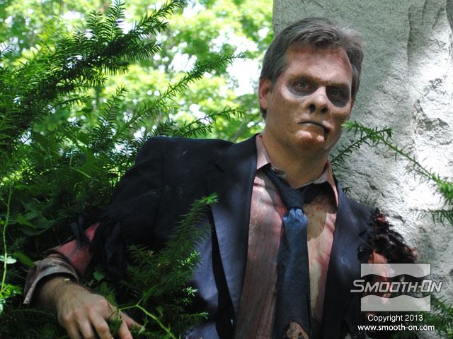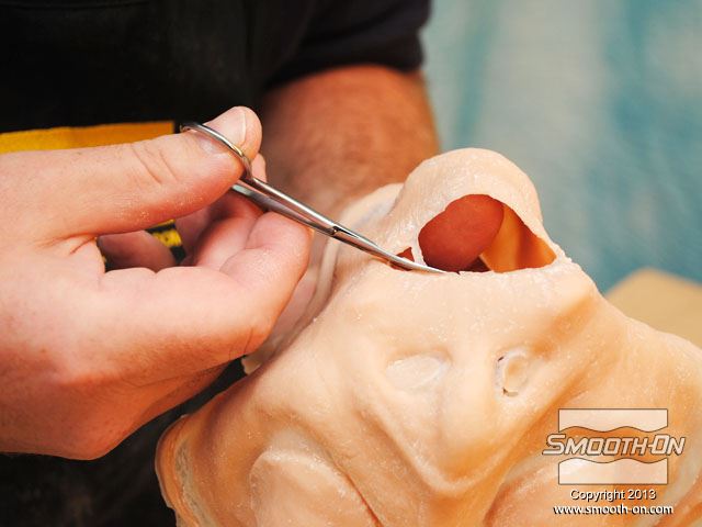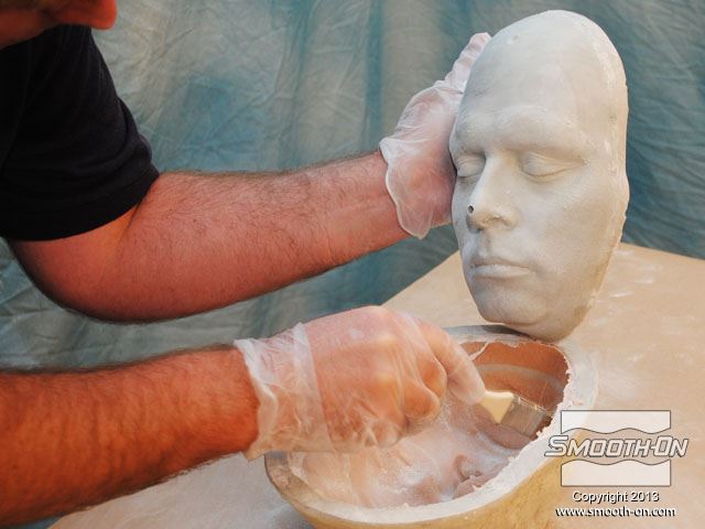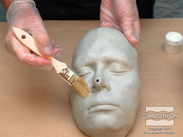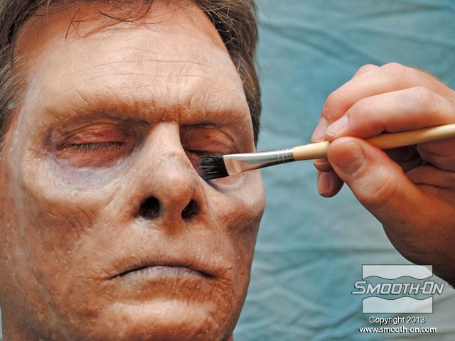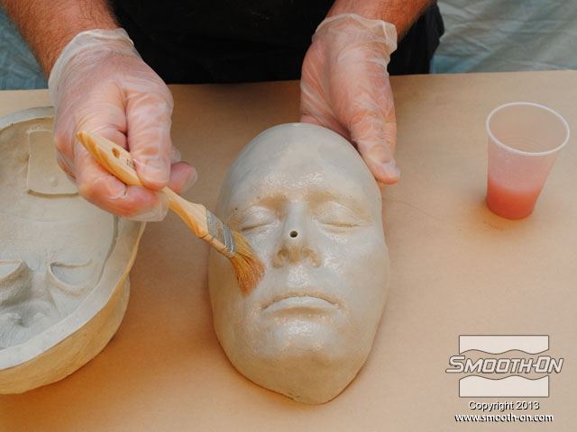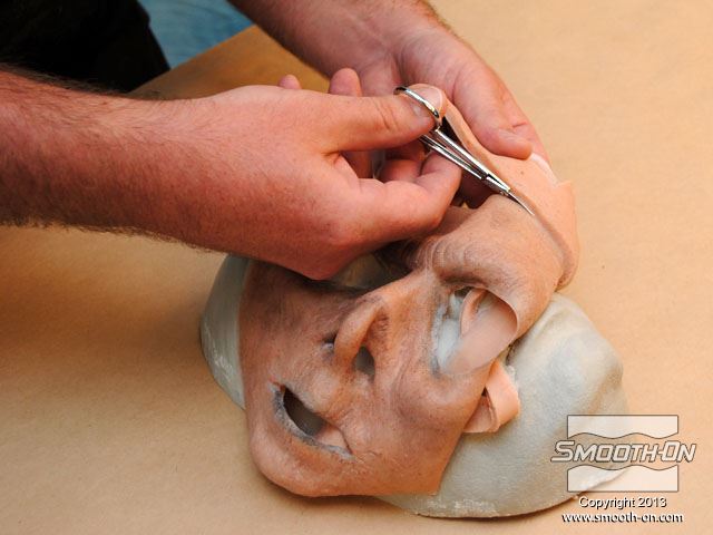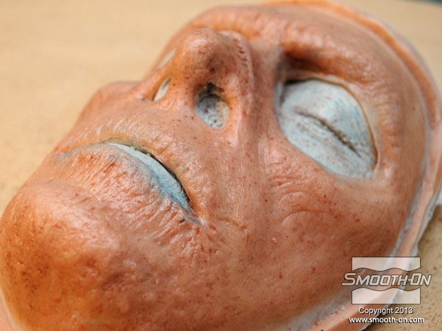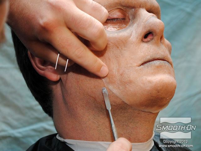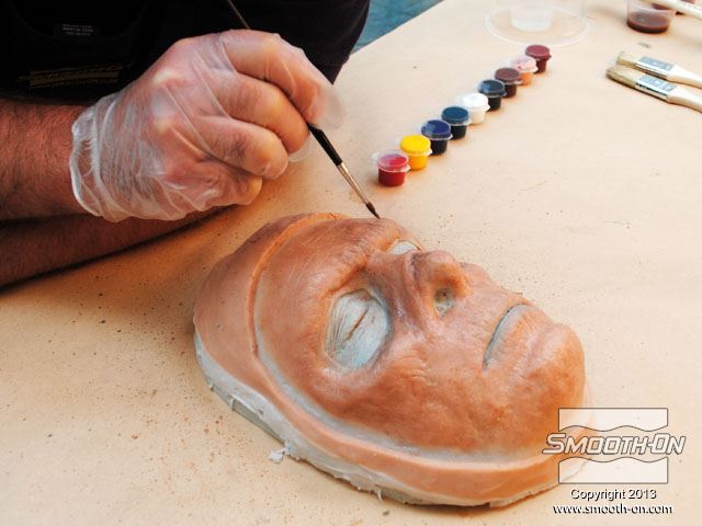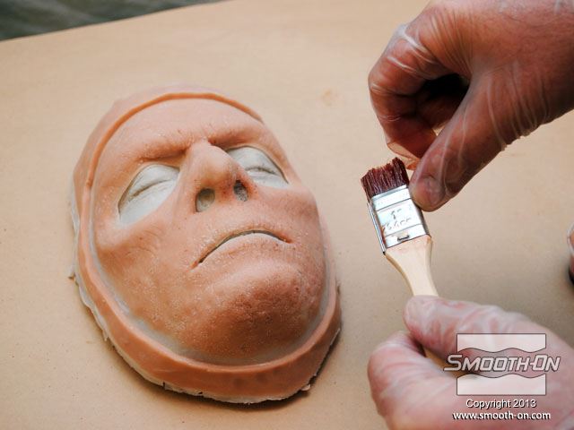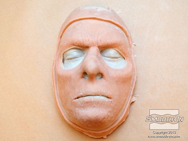 עבור התהליך משתמשים בתבנית חיובית (זכר) ותבנית שלילית  (נקבה) של פני המודל שהוכנו בעזרת פוליאוריתן למריחה Shell Shock וPlasti-Paste II. מורחים על התבנית הנקבה וקס משחתי לאטימה Sonite Wax. מורחים חומר אטימה Sonite Wax גם על חצי התבנית החיובי. מרססים שכבה דקה של חומר הפרדה לתבניות Ease Release® 200 על חצי התבנית השלילי. בעזרת מברשת, מורחים חומר הפרדה Ease Release 200 בתוך הפרטים העמוקים של חצי התבנית השלילית. מרססים שכבה דקה של חומר הפרדה Ease Release 200 גם על חצי התבנית החיובי. מורחים את חומר ההפרדה Ease Release 200 על גבי חצי התבנית החיובי ומוודאים שהחומר מכסה את כל משטחי התבנית. מודדים את חלק הבסיס של סיליקון דמוי גוף Dragon Skin® FX-Pro מודדים כמות שווה לפי נפח גם של המקשה של סיליקון ליציקה  Dragon Skin® FX-Pro. יחס הערבוב של סיליקון רך ליציקה Dragon Skin® FX-Pro הוא 1A:1B לפי נפח. לוקחים כמות קטנה של פיגמנט לסיליקון Silc Pig בצבע דם.. מערבבים את ה פיגמנט לסיליקון Silc Pig בחלק המקשה של הDragon Skin® FX-Pro. מערבבים את החומרים ביסודיות. מורחים בעזרת מברשת שכבה של Dragon Skin® FX-Pro על חצי התבנית החיובי. מורחים בעזרת מברשת שכבה של Dragon Skin® FX-Pro על גם על חצי התבנית השלילי. שוקלים 50 גרם של חלק הבסיס של סיליקון ליציקה Dragon Skin® FX-Pro. שוקלים 50 גרם של חלק המקשה של סיליקון ליציקה Dragon Skin® FX-Pro. שוקלים 100 גרם של מרכך SLACKER. מרכך ליצירת ג'ל סיליקון שילוב של 50 גרם בסיס סיליקון Dragon Skin® FX-Pro, עם 50 גרם של מקשה Dragon Skin® FX-Pro ו100 גרם של חומר מרכך SLACKER כדי להכין את ג'ל הסיליקון הרך (יחס ערבוב 1A:1B:2SLACKER לפי משקל). לוקחים כמות קטנה של פיגמנט לסיליקון בצבע עור Silc Pig® Fleshtone. מערבבים את פיגמנט הSilc Pig® Fleshtone עם חלק המקשה של סיליקון ליציקה Dragon Skin® FX-Pro. שופכים את כל החומרים למיכל ערבוב נקי. מערבבים את החומרים ביסודיות עד לקבלת גוון אחיד. שופכים את הסיליקון הנוזלי אל חצי התבנית השלילי בזרם חלש כדי לא ליצור בועות. מסובבים את חצי התבנית השלילי כך שהחומר יכסה את כל התבנית. סוגרים את חצי התבנית החיובי (הזכר) על חצי התבנית השלילי (נקבה). מפעילים לחץ בעזרת הידיים על התבנית. משתמשים במשקולות כדי לשמר את הלחץ בזמן התמצקות החומר. מניחים לחומר להתמצק במשך לפחות 60 דקות. מורחים אבקת טלק מסביב לתבנית כדי להפחית את דביקות ג'ל הסיליקון. פותחים את התבנית לאט ובזהירות בעזרת שני מברגים. מפרידים את חצי התבנית לאט ומורחים עוד מעט טלק כדי להקל על התהליך. מוציאים את חצי התבנית החיובי. מוציאים את יציקת סיליקון Dragon Skin® FX-Pro מחצי התבנית השלילי בעזרת מברשת ואבקת טלק. שוטפים את  ה מסכת סיליקון במים כדי להסיר עודפי אבקת טלק. חותכים בזהירות, בעזרת מספריים חדות, את חורי הפה, עיניים ואף. כעת אפשר לצבוע את מסכת הסיליקון בעזרת  Psycho Paint® סיליקון המאפשר צביעה על סיליקון.  מכינים את כל החומרים עבור הצביעה -, סיליקון ל צביעה של סיליקון Psycho Paint®, טולואן ופיגמנט Silc Pig. מודדים את חלק הבסיס של הPsycho Paint®. מודדים כמות שווה של מקשה ה Psycho Paint®. יחס הערבוב הוא 1:1 לפי נפח או משקל. מערבבים את שני מרכיבי ה Psycho Paint® בכוס ערבוב גדולה. מדללים את ה Psycho Paint® בעזרת טולואן או בעזרת עד שהוא נעשה נוזלי מספיק למריחה. מערבבים את מרכיבי הPsycho Paint® עם הטולואן. מוסיפים כמות קטנה של פיגמנט Silc Pig בצבע דם למנה של צבע Psycho Paint® נקי. חותכים מברשת רגילה כך שאורך השערות הוא כ1 ס בעזרת המברשת מורחים את הצבע על המסיכה. מערבבים כמות קטנה של פיגמנט לסיליקון Silc Pig כחול וSilc Pig שחור במנה של Psycho Paint® נקי. מטרת שכבת צבע זו היא להדגיש אזורים מפורטים ולהצללות. ניתן ליצור שכבות צבע נוספות בשיטה זו. מניחים ל סיליקון עם הפיגמנט הPsycho Paint® להתמצק במשך 4 שעות. לאחר שסיליקון הPsycho Paint® התמצק, חותכים את הפלשאים (גראדים) בעזרת מספרים חדים. מודדים כמות קטנה של דבק סיליקון לעור Skin Tite. יחס הערבוב של המרכיבים הוא 1A:1B לפי נפח. מערבבים ביסודיות את מרכיבי הSkin Tite. מורחים שכבה דקה של דבק הSkin Tite על פני המודל. כאשר הSkin Tite מקבל מרקם דביק (Tacky) מניחים א