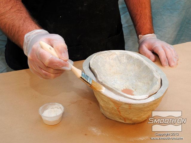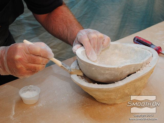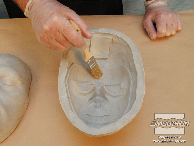 לחיצה להגדלת תמונה בעזרת מברשת, מורחים חומר הפרדה Ease Release 200 בתוך הפרטים העמוקים של חצי התבנית השלילית. בעזרת מברשת, מורחים חומר הפרדה Ease Release 200 בתוך הפרטים העמוקים של חצי התבנית השלילית.