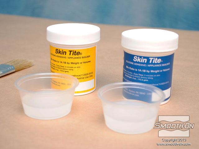 לחיצה להגדלת תמונה מודדים כמות קטנה של דבק סיליקון לעור Skin Tite. יחס הערבוב של המרכיבים הוא 1A:1B לפי נפח. מודדים כמות קטנה של דבק סיליקון לעור Skin Tite. יחס הערבוב של המרכיבים הוא 1A:1B לפי נפח.