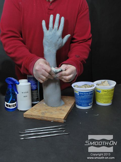 לחיצה להגדלת תמונה בעזרת שילוב של מים ועוד מעט בצק אפוקסי Free Form® Earth ממשיכים להוסיף חומר ולהחליק אותו על גבי מודל היד. בעזרת שילוב של מים ועוד מעט בצק אפוקסי Free Form® Earth ממשיכים להוסיף חומר ולהחליק אותו על גבי מודל היד.