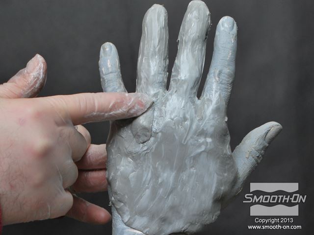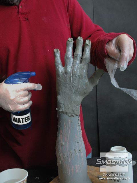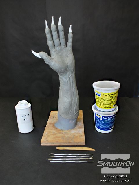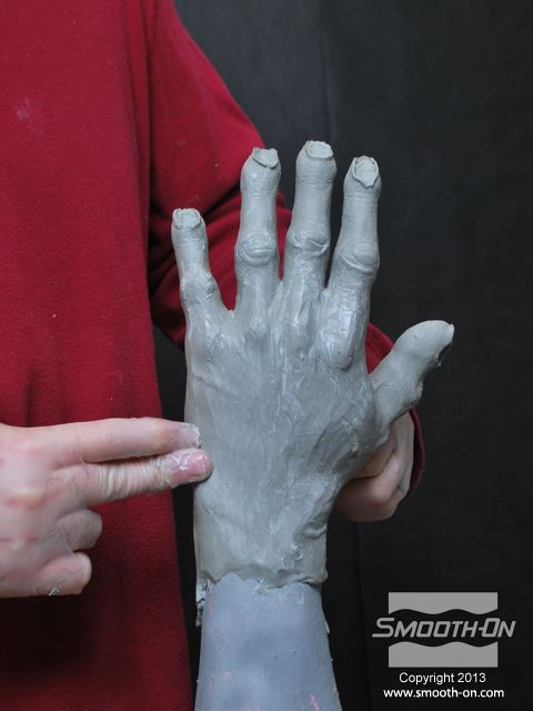 עבור פרוייקט זה משתמשים ביד שהועתקה בתור הבסיס עליו מפסלים על בצק האפוקסי Free Form® Earth. אפוקסי Free Form® Earth הוא חומר פיסול מקצועי וקל לעבודה. יחס הערבוב של החומר הוא 1:1 לפי נפח. לוקחים כמות שווה של בסיס ומקשה של ה  חימר לפיסול על בסיס אפוקסי  ]Free Form® Earth . לוקחים כמות שווה של בסיס ומקשה של ה  חימר לפיסול על בסיס אפוקסי  ]Free Form® Earth . מכניסים את הבסיס והמקשה למים למספר שניות. לאחר שילוב המרכיבים,  בצק אפוקסי לפיסול Free Form® Earth מקבל גוון אפור שמקל על הבחנה בפרטים. מרקמו של חימר האפוקסי Free Form® Earth מאפשר בנייה מהירה על גבי מודל היד. מחליקים את בצק האפוקסי Free Form® Earth בעזרת מים רגילים. הדבר גם מונע מדברים להדבק לבצק. קל לעבד את בצק האפוקסי Free Form® Earth בעזרת מקל ארטיק. מערבבים עוד בצק אפוקסי Free Form ומוסיפים על מודל היד. בעזרת שילוב של מים ועוד מעט בצק אפוקסי Free Form® Earth ממשיכים להוסיף חומר ולהחליק אותו על גבי מודל היד. צפיפותו של בצק האפוקסי Free Form® Earth מאפשרת לחומר לשמור על צורתו, גם כשמעבדים אותו בכלי פיסול. מרססים מעט מים על נייר צלופן כדי להעניק לבצק האפוקסי Free Form® Earth את המרקם הרצוי. המים מונעים מנייר הצלופן להידבק לבצק האפוקסי Free Form® Earth. ע בצק האפוקסי מציג את הפרטים שפוסלו בו בעזרת כלי הפיסול. זמן העבודה הארוך של בצק האפוקסי Free Form® Earth מאפשר הוספה של חומר וחידוד פרטים מבלי לפחד שהאפוקסי יתמצק בזמן העבודה. ניתן ליצור פרטים כמו ורידים בקלות ע מערבבים עוד בצק אפוקסי Free Form® Earth ומוסיפים על הגבי מודל היד. שוב משתמשים במים פשוטים כדי להחליק את בצק אפוקסי לפיסול Free Form® Earth ולהעלים את התפרים. קיים מגוון כלים רחב שניתן לעבד בעזרתם את בצק האפוקסי Free Form® Earth לכל צורה רצוייה. עושים פרטים נוספים בעזרת נייר צלופן באותה השיטה. בצק האפוקסי ההמוצק מציג פרטים ומרקם מצויינים. מכניסים ציפורניים יצוקות משרף למקום על יד האפוקסי כדי לראות שהם ממוקמות כרצוי. את הציפרניים יוצקים בנפרד. בדוגמה זו, משתמשים במברשת רגילה לחתולים על גבי צלופן כדי העניק לבצק האפוקסי Free Form® Earth כדי להעניק לו מרקם של עור רך. הברשת בצק האפוקסי במברשת החתול יוצרת אפקט מאוד ריאליסטי של עור אמיתי. לאחר שחומר התמצק במשך 24 שעות, המודל מוכן וניתן להכין תבנית ממנו כדי ליצוק בה העתקים. לאחר שחומר התמצק במשך 24 שעות, המודל מוכן וניתן להכין תבנית ממנו כדי ליצוק בה העתקים.