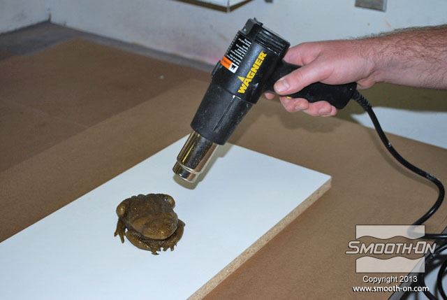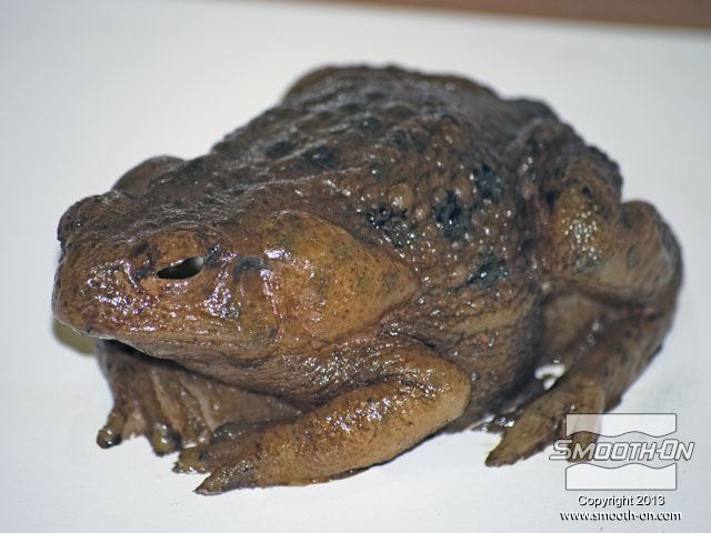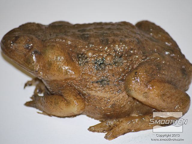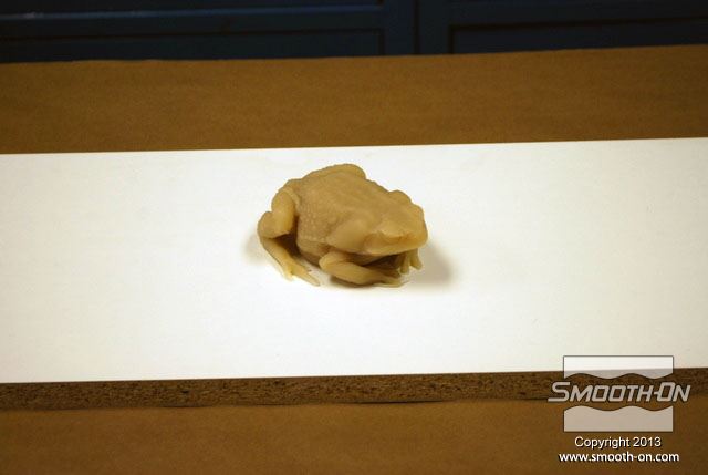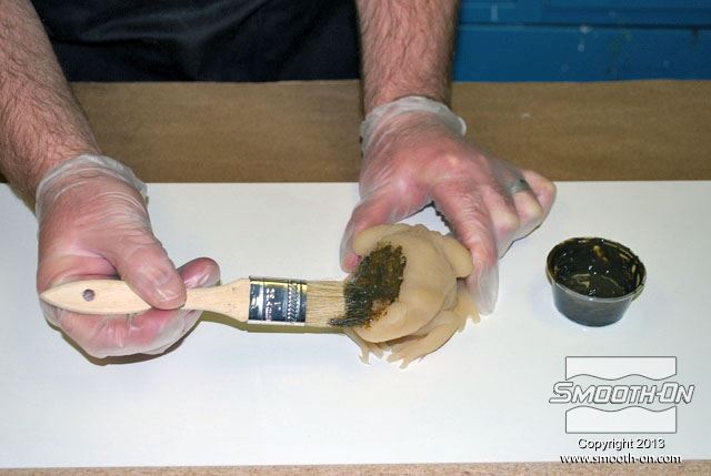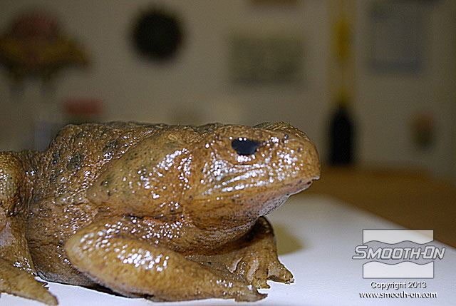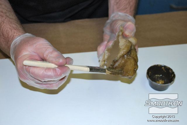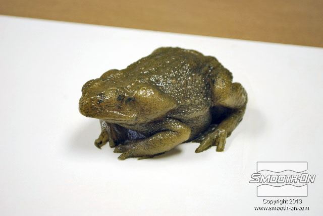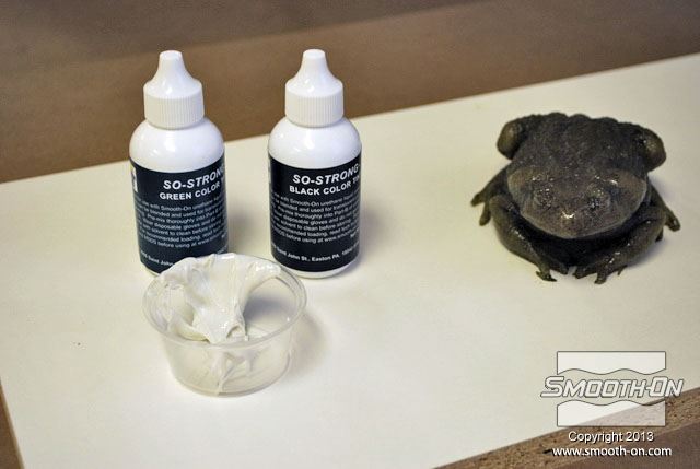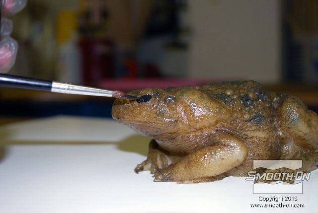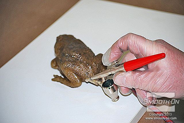 מכינים מראש את כל מה שצריך עבור הצביעה: צנצנות לערבוב, פיגמנטים לפוליאוריתן  So-Strong, מיכלי ערבוב ומקלות, מברשות, טרפנטין ומודל מפוליאוריתן גמיש ליציקה Vytaflex 30. מוציאים את יציקת הReoflex 30 מתבנית ה סיליקון ליציקה על בסיס פלטינום  Dragon skin 10. משתמשים בקרש מלאמין כלוח בסיס. מניחים את מודל הצפרדע על לוח המלאמין. מודדים את חלקי ה גומי פוליאוריתן למריחה Brush-On 40 ביחס ערבוב 1:1 לפי נפח. שופכים את המקשה של הBrush On 40 לתוך מיכל הערבוב. שופכים למיכל הערבוב גם את הבסיס של ה פוליאוריתן למריחה Brush On 40. מערבבים את החומרים ביסודיות. שופכים כמות קטנה של חומר מעורבב לכוס קטנה. מוסיפים לחומר בכוס הקטנה מעט פיגמנט חום. מערבבים את הפיגמנט עם החומר ביסודיות. מוסיפים כמות קטנה של טרפנטין כדי לדלל את גומי הפוליאורתן. מערבבים את המדלל ביסודיות בחומר. מורחים את החומר על כל המשטח החיצוני של המודל. מוודאים שמכסים את כל המשטחים במודל. מוודאים שמכסים את כל המשטחים במודל. משתמשים באקדח חם כדי להאיץ את התמצקות הפוליאוריתן Brush On 40. בזמן שזמן העבודה של החומר עוד לא חלף, מעבירים לכוס נוספת כמות קטנה של פוליאורתן Brush On מעורבב. מוסיפים לחומר בכוס הקטנה מעט פיגמנט ירוק. מוסיפים גם מעט פיגמנט שחור. מערבבים ביסודיות את החומר עם הפיגמנטים. מוסיפים בערך 5 חלקים של טרפנטין (בערך פי 5 מכמות החומר של הבסיס) כדי לדלל את החומר. מוסיפים מספיק טרפנטין עד שמתקבלת תערובת דלילה, בערך בצמיגות של חלב. שופכים את התערובת למברשת אוויר (Air Brush). צובעים את הפרטים הקטנים בעזרת מברשת האוויר גומי הפוליאוריתן המדולל זורם בקלות דרך מברשת האוויר. פרטי העור גמורים! לבסוף, צובעים את העיניים בעזרת אותה תערובת של פוליאוריתן Brush On 40 בעזרת מברשת. מניחים לצבע להתמצק במשך לילה. לאחר התמצקות הצבע היצירה גמורה. הצפרדע נראית מציאותית מאוד וצבע שנעשה בשיטה זו הינו עמיד ביותר!