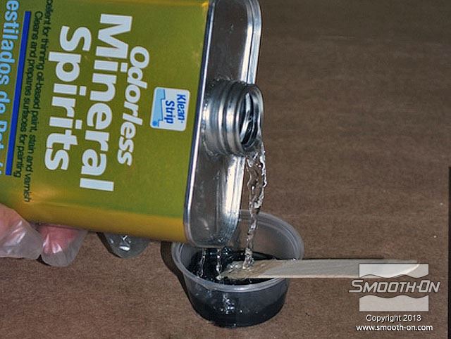 לחיצה להגדלת תמונה מוסיפים בערך 5 חלקים של טרפנטין (בערך פי 5 מכמות החומר של הבסיס) כדי לדלל את החומר. מוסיפים בערך 5 חלקים של טרפנטין (בערך פי 5 מכמות החומר של הבסיס) כדי לדלל את החומר.