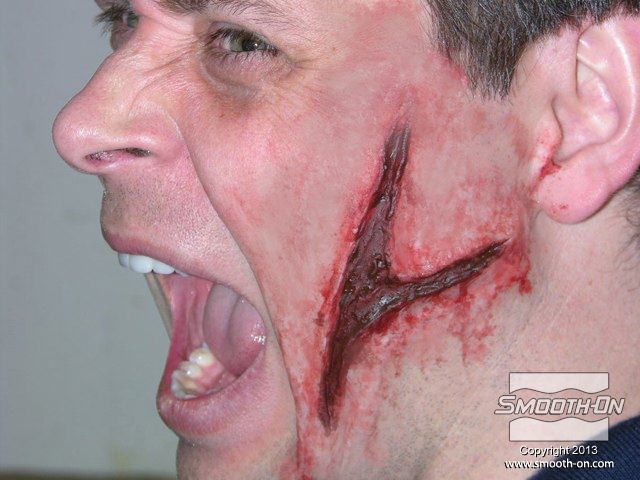 מפסלים את המודל בעזרת חימר ללא גורפית LBT/NSP. מרססים על כל המשטחים חומר הפרדה Ease Release 200. שוקלים את חלק הבסיס של פוליאורתן למריחה Shell Shock (יחס ערבוב 1A:5B לפי משקל). שוקלים את מקשה הפוליאורתן למריחה Shell Shock (יחס ערבוב 1A:5B לפי משקל). מעבירים את שני החומרים לכוס ומערבבים ביסודיות. מורחים שכבה דקה של פוליאוריתן Shell Shock מחוזק עם סיבים על המודל כדי לתפוס את כל הפרטים. מודדים ומערבבים מנה נוספת של פוליאורתן קשיח Shell Shock. מורחים את המנה השניה על המודל ויוצרים שכבה מעט עבה יותר של פוליאוריטן Shell Shock. מודדים ומערבבים מנה שלישית של פוליאורתן Shell Shock. מורחים את השכבה השלישית. יוצרים תבנית בעובי כולל של כ1 ס מסירים את התבנית מהקרש והמודל. מסירים מהתבנית עודף חימר (אם נשאר) בעזרת מקל עץ. לאחר שמשייפים ומחליקים את קצוות התבנית, מודדים את הבסיס של סיליקון למריחה Skin Tite (יחס ערבוב 1:1 לפי נפח). מודדים גם את המקשה של הסיליקון Skin Tite (יחס ערבוב 1A:1B לפי נפח). מוסיפים למקשה הSkin Tite פיגמנט לסיליקון Silc-Pig בצבע עור. מוסיפים את המקשה הצבוע בפיגמנט לבסיס הSkin Tite. מערבבים את הסיליקון למגע גוף למריחה Skin Tite ביסודיות כדי ליצור אפקט איפור מושלם. מורחים את סיליקון הSkin Tite בתבנית הפוליאוריטן בעזרת מקל עץ. בעזרת המקל, מסירים עודף חומר מהתבנית. לאחר 10 דקות של התמצקות מורחים טלק על מודל הסיליקון Skin Tite. מוציאים את צלקת הסיליקון Skin Tite מתבנית הפוליאוריתן Shell Shock. איפור הצלקת מסיליקון Skin Tite מוכן להדבקה על פני המודל. מערבבים מעט סיליקון Skin Tite ומורחים על פני המודל. מניחים על השכבה החדשה את צלקת הסיליקון. מורחים עוד סיליקון Skin Tite על קצוות הפרופ כדי למזג אותו עם העור. לאחר שפרופ הסיליקון Skin Tite מתמצק לחלוטין ניתן לצבוע אותו באיפור, כדי להעניק לו מראה מציאותי. הפרופ המוכן מסוגל להמתח ולנוע עם פני המודל!