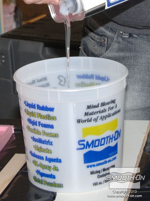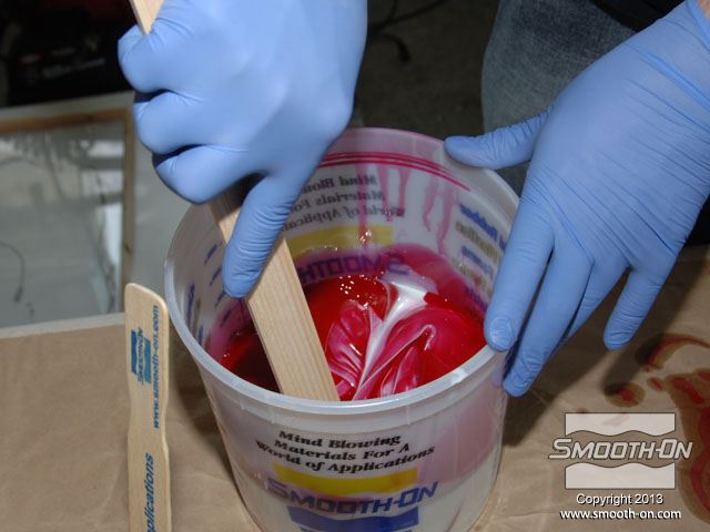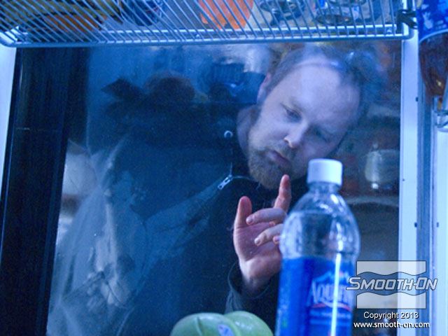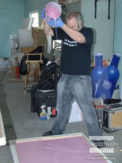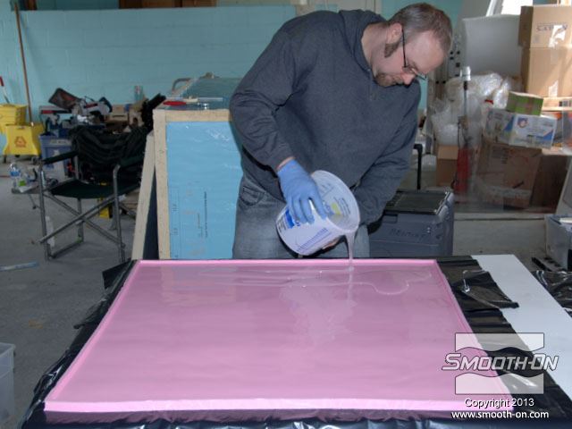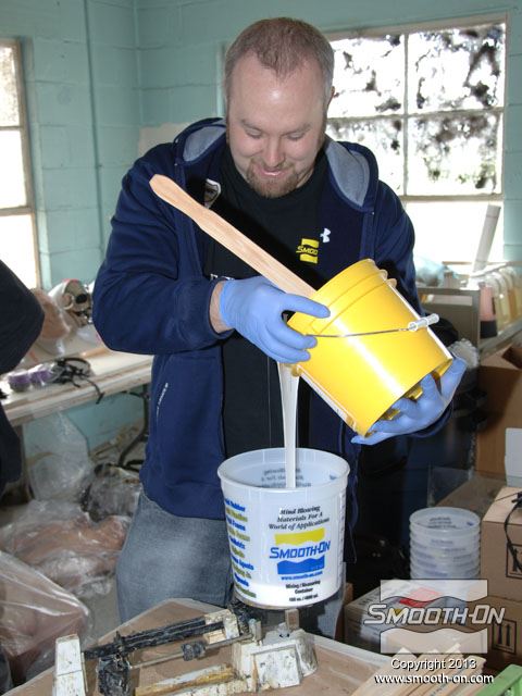 לחיצה להגדלת תמונה מכיוון שאין לו מכשיר להוצאת אוויר מתבנית הסיליקון Mold Max 30, אריק שופך את הסיליקון מגובה רב בכדי ליצור זרם ארוך ובכך לגרום לבועות לצאת החוצה. מכיוון שאין לו מכשיר להוצאת אוויר מתבנית הסיליקון Mold Max 30, אריק שופך את הסיליקון מגובה רב בכדי ליצור זרם ארוך ובכך לגרום לבועות לצאת החוצה.