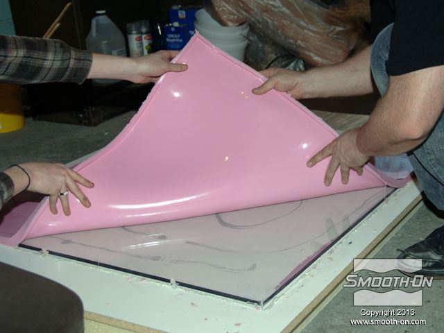 לחיצה להגדלת תמונה מקלפים את תבנית ה סיליקון מעל לוח הקבלר. מכיוון שתבנית עוד מקלפים את תבנית ה סיליקון מעל לוח הקבלר. מכיוון שתבנית עוד "טרייה", אם ניצוק את הפוליאוריטן אליה בשלב זה, הוא לא יתקשה ויתקבל כמשטח דביק וצמיגי.