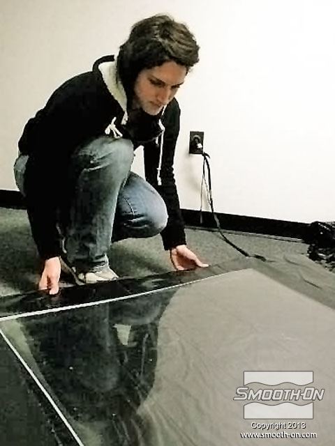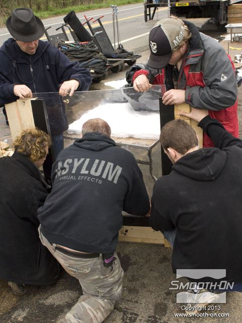 אומן האפקטים אריק פורן מסדר לוח קוולר על בסיס ובונה מסגרת תבנית בעזרת לוחות ודבק. מודדים ומערבבים בסיס של סיליקון ליציקה Mold Max 30 ביחד עם מאיץ (קטליזטור) Fast Cat. הזרז יעזור לתבנית להתמצק גם בתנאי סביבה קרים יחסית. מכיוון שאין לו מכשיר להוצאת אוויר מתבנית הסיליקון Mold Max 30, אריק שופך את הסיליקון מגובה רב בכדי ליצור זרם ארוך ובכך לגרום לבועות לצאת החוצה. מקלפים את תבנית ה סיליקון מעל לוח הקבלר. מכיוון שתבנית עוד בגלל שזמן זה כסף, שמים את התבנית בתוך קופסת חימום כדי לזרז את ההתמצקות. מודדים את הטמפרטורת בעזרת טרמומטר. הוראות להכנת קופסת החימום מופיעות בדף הטכני של Smooth-On. מסדרים את ה תבנית סיליקון  על שולחן שעליו יריעת פלסטיק חד-פעמית. שופכים למיכל מדידה את הבסיס של הפוליאוריתן קשיח דמוי זכוכית SMASH. מודדים כמות שווה של מקשה SMASH ומערבבים ביחד עם הבסיס. שופכים את שרף פוליאוריטן SMASH לאחת מפינות התבנית ומניחים לו להתפלס בעצמו. דרושים לפחות 3 אנשים כדי לחלוץ את לוח הפלסטיק השביר. מרימים את הלוח הSMASH פוליאוריטן דמוי הזכוכית ותבנית הסיליקון נופלת ממנו. הלוח מוכן לשבירה ולכן משנעים אותו בזהירות. שמים את הלוח בתוך מסגרת לנשיאה ומעבירים אותו לסט הצילום. והתוצאה: לוח דמוי זכוכית מ פוליאוריטן שקוף קריסטלי שביר- SMASH לפני צילום הסצינה.