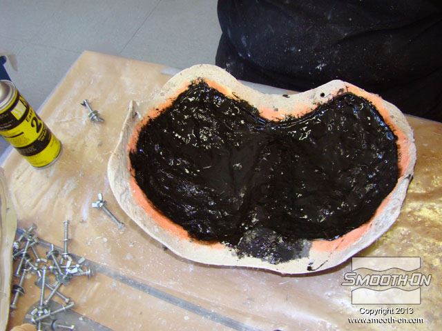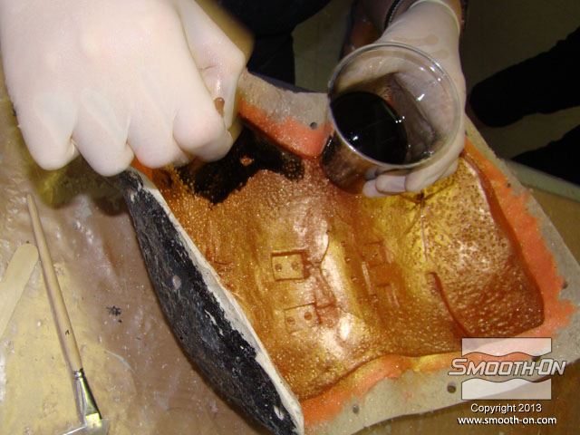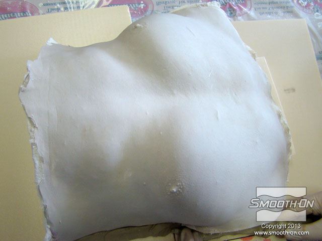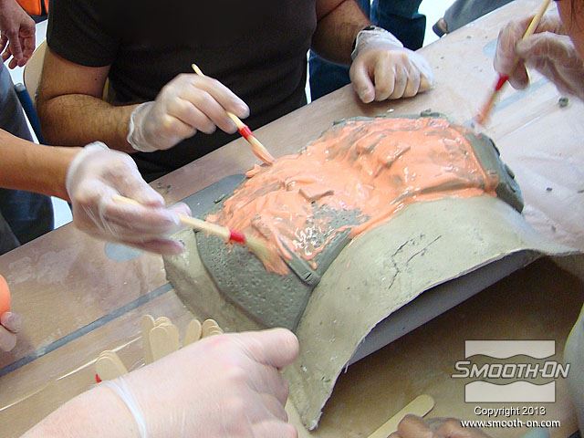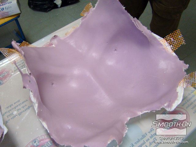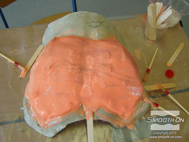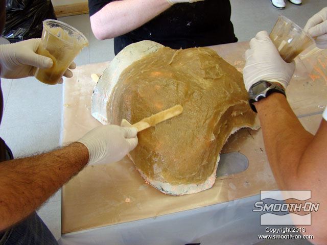 לחיצה להגדלת תמונה לאחר שהסיליקון מתמצק מורחים שכבה של פוליאוריתן מחוזק סיבים למריחה Plasti-Paste כדי ליצור מעיל תמיכה. לאחר שהסיליקון מתמצק מורחים שכבה של פוליאוריתן מחוזק סיבים למריחה Plasti-Paste כדי ליצור מעיל תמיכה.