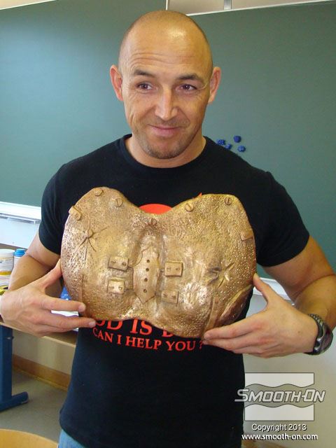 משתמשים באלגינאט מאושר למגע גוף Alja-Safe להעתקת החזה של השחקן. שמים תחבושות גבס על האלגינאט כדי להעניק לו תמיכה מבנית. ה אלגינט לתבניות Alja Safe העתיק את כל פרטי הגוף של השחקן. מכינים יציקת גבס ב תבנית אלגינט Alja safe. מפסלים על יציקת הגבס את פרטי השריון בעזרת חימר מעצבים על בסיס שמן LBT/NSP. מורחים על החימר שכבה דקה של סיליקון למריחה  Rebound 25 כדי ליצור תבנית סיליקון במריחה. מורחים עוד סיליקון לתבניות במריחה Rebound 25 עד שמגיעים לעובי של 1 ס לאחר שהסיליקון מתמצק מורחים שכבה של פוליאוריתן מחוזק סיבים למריחה Plasti-Paste כדי ליצור מעיל תמיכה. מניחים לפוליאוריטן Plasti-Paste להתמצק. מסירים את התבנית מהמודל. סיליקון למריחה Rebound 25 העתיק את כל פרטי המודל. מורחים אבקת פיגמנט לאפקטים מיוחדים Cast Magic על משטח התבנית כדי ליצור אפקט מתכתי. מורחים בתבנית פוליאוריתן קשיח מהיר  Smooth Cast 325 צבוע בפיגמנט So-Strong שחור. מניחים ל פוליאוריתן קשיח Smooth Cast 325 להתמצק במשך 60 דקות. יציקת הפוליאורתן הגמורה מתאימה במדוייק לשחקן.