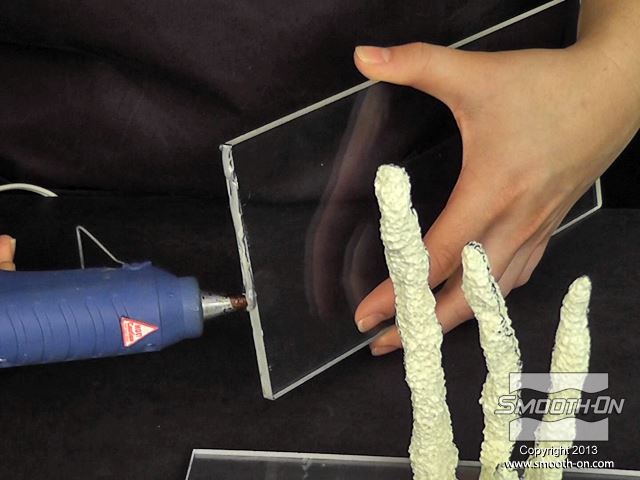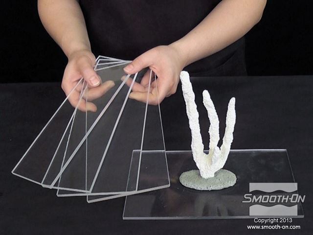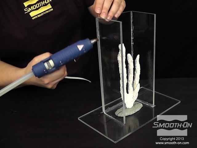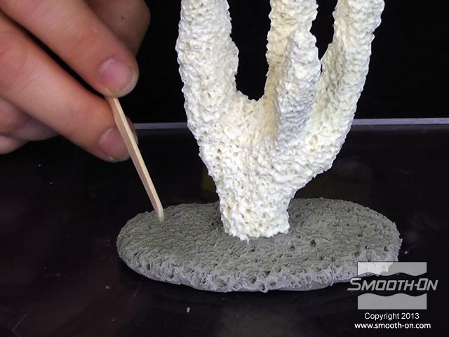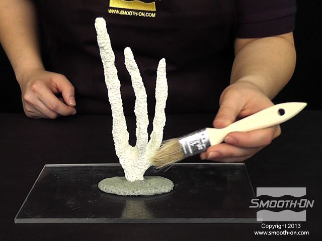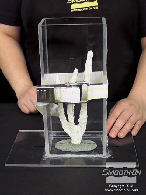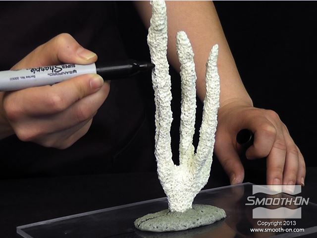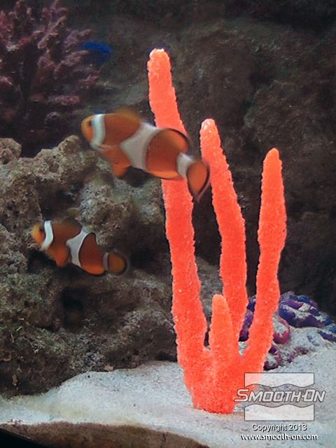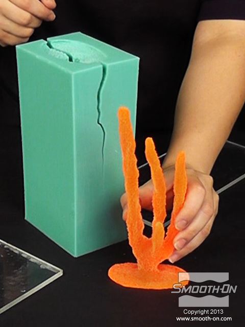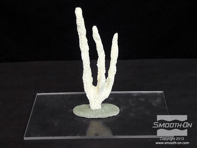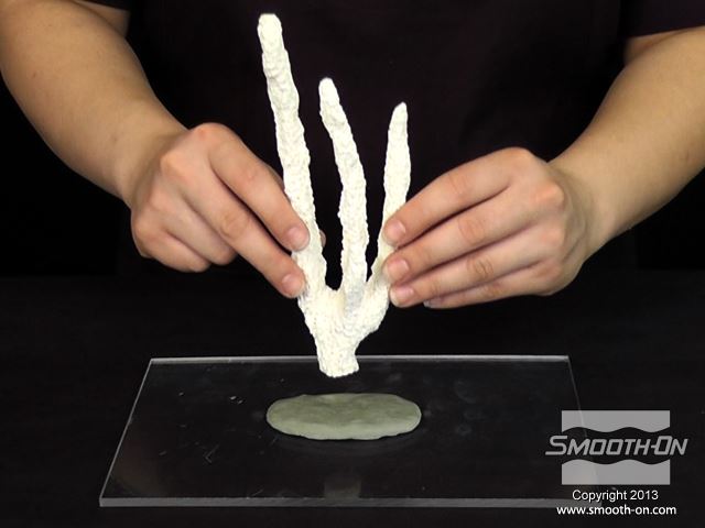 מתחילים עם מודל מקורי קיים. במקרה זה, המודל המקורי נקנה בחנות חיות מקומית. במקרה זה, לוח הבסיס יהיה עשוי מאקריליק שקוף. כיוון שמודל האלמוג המקורי אינו מסוגל לעמוד לבדו, בונים לו בסיס מחימר לעיצוב נטול גופרית LBT/NSP. בסיס החימר ייצב ויאזן את המודל בזמן הכנת התבנית. מפסלים את פיסת החימר לצורת אליפסה שטוחה (בגודל פרופורציוני למודל) ומהדקים אותה ללוח הבסיס מאקריליק. ממרכזים את המודל ומטביעים אותו בפיסת החימר LBT/NSP. יוצרים בחימר מרקם מציאותי בעזרת מקל ארטיק שבור. המטרה היא לחקות אפקט של מבנה אלמוג אמיתי. על המודל יוצקים סיליקון נוזלי להכנת התבנית ונחימים לו להתמצק לגוש אחד (Block). לאחר מכן יש לחתוך את תבנית הסיליקון בסכין חד, כדי לחלוץ את המודל. יש לסמן את הקו שבו נרצה לחתוך את התבנית כבר בשלב זה, לפני שיוצקים את הסיליקון על המודל. בעזרת טוש לא מחיק מסמנים קו הפרדה על המודל המקורי במקום בו נרצה לחתוך את התבנית בהמשך התהליך. במקרה זה, כיוון שלמודל המקורי יש פרטים רבים, משתמשים בחומר הפרדה נוזלי, שיגיע לפרטים באופן יעיל יותר. מערבבים איזופרופאנול עם סבון כלים ביחס ערבוב 2Isopropanol : 1Soap לפי נפח. מורחים בטפיחה את חומר ההפרדה על המודל. מומלץ לקצוף את הסיבים של המברשת איתה עובדים כדי להקל על התהליך (להפוך אותו לאפקטיבי יותר). בונים מסגרת לתבנית מלוחות אקריליק. ממקמים את הלוחות סביב המודל המקורי כך שיהיה מרווח של לפחות 1 ס מערבבים את האלכוהול והסבון ביסודיות. מורחים בטפיחה את חומר ההפרדה על המודל ומניחים לו להתמצק במשך 30 דקות. מדביקים בדבק חם את לוחות האקריליק ללוח הבסיס. מוודאים שמסגרת התבנית אטומה לחלוטין כדי למנוע דליפה של סיליקון נוזלי דרך התפרים. ממשיכים להדביק עד שמסגרת התבנית מושלמת. סוגרים את המסגרת גם בעזרת רצועה ניתנן להתאמה (ראצ'ט) כדי לסגור בחוזקה את קווי התפר ולנעול את התבנית. מסגרת התבנית אטומה, מחוזקת ומוכנה ליציקת סיליקון להכנת תבנית Mold Star® 15. הכנת התבנית תעשה בעזרת סיליקון ללא צורך בואקום Mold Star® 15. יחס הערבוב של החומר הוא 1:1 לפי נפח. מודדים את הבסיס של הסיליקון Mold Star® 15. מודדים כמות שווה של מקשה סיליקון להכנת תבניות ללא צורך בואקום Mold Star® 15. מעבירים את הבסיס והמקשה למיכל ערבוב גדול ומערבבים ביסודיות, עד שמתקבל חומר בצבע אחיד. זמן העבודה של סיליקון להכנת תבנית Mold Star® 15 הוא 50 דקות. סיליקון Mold Star® 15 אינו דורש הכנסה לתא ואקום! שופכים את גומי הסיליקון הנוזלי אל תחתית מסגרת התבנית בזרם ארוך ודק. יוצקים את הסיליקון Mold Star® 15 לנקודה יחידה בתבנית ומניחים לו לעלות בעצמו על המודל המקורי. לאחר שהסיליקון Mold Star® 15 התמצק במשך 4 שעות, מסירים את לוחות המסגרת . מרימים את התבנית ומפרידים אותה מלוח הבסיס. מסירים את בסיס החימר מהמודל. כדי לחלוץ את המודל מתבנית הסיליקון Mold Star® 15, עושים בה מספר חתכים (לאורך הקווים שסימנו מוקדם יותר). מומלץ להעזר באדם נוסף שיחזיק את התבנית פתוחה בזמן החיתוך. כדי לאפשר חליצה נוחה, יש לחתוך בין ממשיכים לחתוך מספיק כדי להוציא את המודל מהתבנית (לא לחתוך עד לתחתיץ התבנית!). תבנית הסיליקון Mold Star® 15 העתיקה במדוייק את פרטי המודל המקורי! כדי לספק תמיכה לתבנית בזמן היציקה, ממקמים חזרה שני לוחות אקריליק על התבנית, כך שילחצו את התפרים בתבנית. נועלים את התבנית ולוחות האקריליק בעזרת ראצ'ט. כעת, התבנית מוכנה ליציקה. יציקה - משתמשים בפוליאורתן שקוף קשיח Smooth-Cast® 325 מסדרת COLORMATCH וצבע פלואורוסנטי Ignite. מודדים את הבסיס של הפוליאוריתן קשיח Smooth-Cast® 325. מודדים כמות שווה לפי נפח של המקשה של הפוליאורתן קשיח Smooth-Cast® 325. מערבבים את הפיגמנט Ignite הכתום, לפני שמוסיפים אותו למקשה. מערבבים את הפיגמנט (המעורבב מראש) עם המקשה עד שמתקבלת תערובת בצבע אחיד. מעבירים את מקשה הפוליאוריתן הקשיח Smooth-Cast® 325 הצבוע למיכל ערבוב גדול יותר. מוסיפים למיכל הערבוב גם את הבסיס של הSmooth-Cast® 325 ומערבבים עם המקשה ביסודיות במשך 90 שניות. זמ