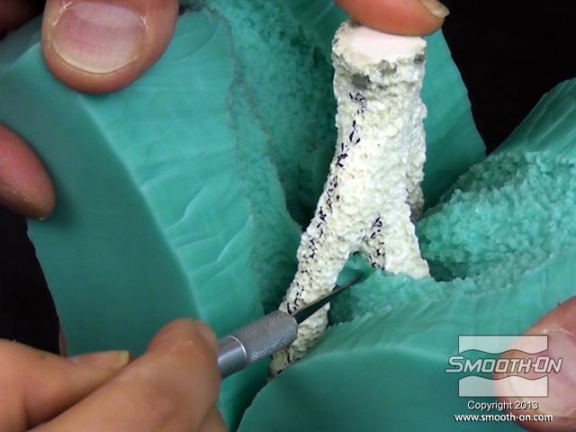 לחיצה להגדלת תמונה כדי לחלוץ את המודל מתבנית הסיליקון Mold Star® 15, עושים בה מספר חתכים (לאורך הקווים שסימנו מוקדם יותר). מומלץ להעזר באדם נוסף שיחזיק את התבנית פתוחה בזמן החיתוך. כדי לחלוץ את המודל מתבנית הסיליקון Mold Star® 15, עושים בה מספר חתכים (לאורך הקווים שסימנו מוקדם יותר). מומלץ להעזר באדם נוסף שיחזיק את התבנית פתוחה בזמן החיתוך.