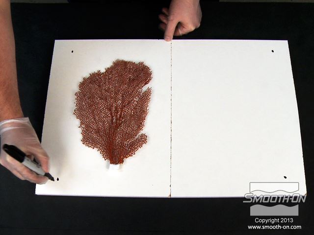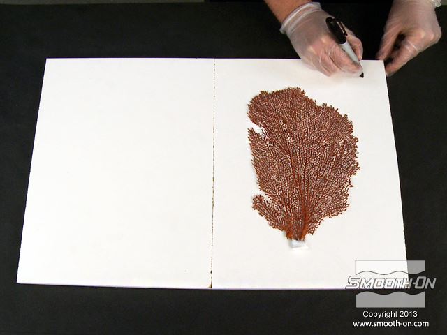 לחיצה להגדלת תמונה מניחים את מודל מניפת הים המקורי על חצי הלוח הימני של תבנית בצק הסיליקון Equinox® 40. מניחים את מודל מניפת הים המקורי על חצי הלוח הימני של תבנית בצק הסיליקון Equinox® 40.