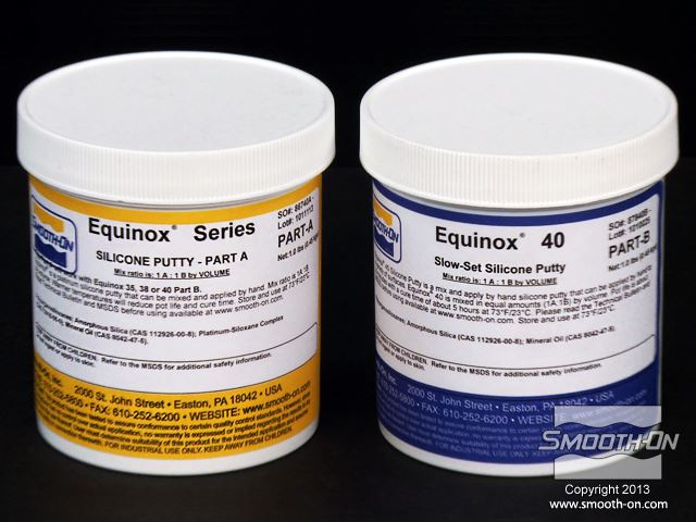 לחיצה להגדלת תמונה שתי מנות בצק הסיליקון Equinox® 40 מוכנות לערבוב אחת עם השניה. שתי מנות בצק הסיליקון Equinox® 40 מוכנות לערבוב אחת עם השניה.