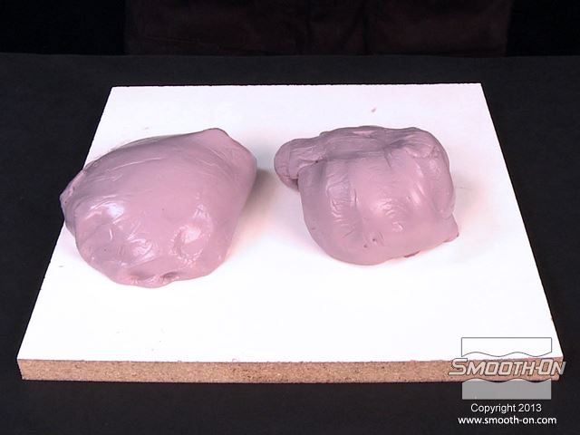לחיצה להגדלת תמונה מניחים את שתי מנות בצק הסיליקון Equinox® 40, שהוכנו בנפרד, על לוח הבסיס. מניחים את שתי מנות בצק הסיליקון Equinox® 40, שהוכנו בנפרד, על לוח הבסיס.