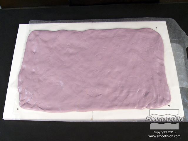 לחיצה להגדלת תמונה מפעילים לחץ על בצק הסיליקון מהמרכז החוצה ומפזרים את הבצק על כל הלוח, עד לנקודות הגבול שסימנו מוקדם יותר. המטרה היא ליצור כיסוי אחיד של לוח הבסיס בעובי של כ1 ס מפעילים לחץ על בצק הסיליקון מהמרכז החוצה ומפזרים את הבצק על כל הלוח, עד לנקודות הגבול שסימנו מוקדם יותר. המטרה היא ליצור כיסוי אחיד של לוח הבסיס בעובי של כ1 ס"מ.
