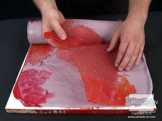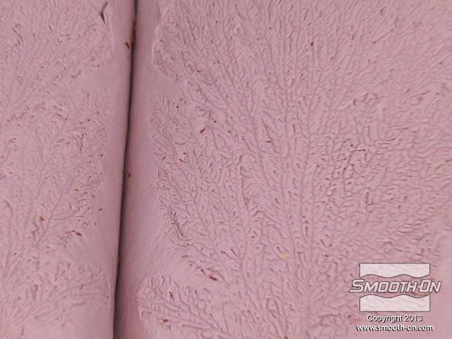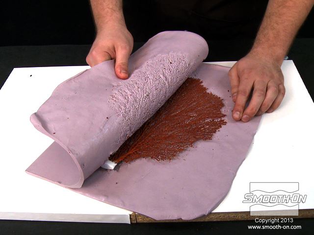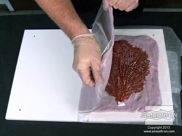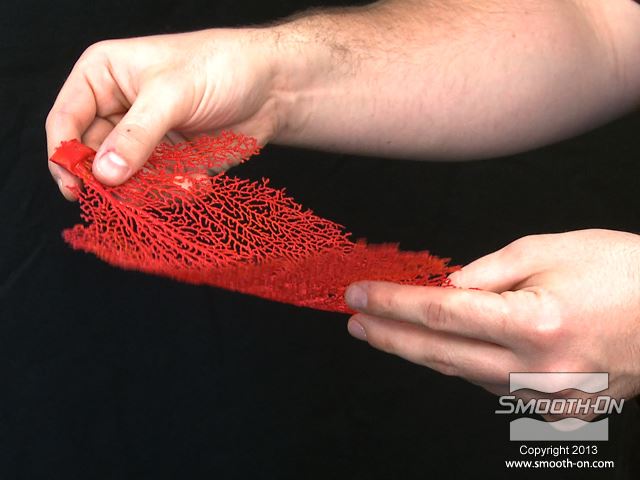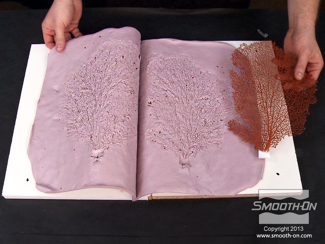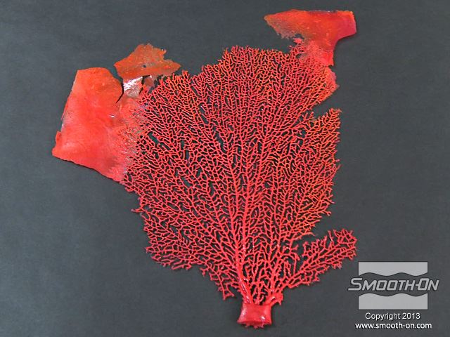 המודל המקורי הוא מניפת ים יבשה עם פרטים מורכבים ועדינים. מידותיה הם 28 ס"מ (גובה) על 18 ס"מ (רוחב). מפעילים לחץ על בצק הסיליקון מהמרכז החוצה ומפזרים את הבצק על כל הלוח, עד לנקודות הגבול שסימנו מוקדם יותר. המטרה היא ליצור כיסוי אחיד של לוח הבסיס בעובי של כ1 ס מבט צד על מניפת הים המיובשת. עובי המודל הוא מאוד דק (~ 1 מ מניחים שני לוחות אחד לצד השני ליצירת משטח עבודה אחד. משטח העבודה ישמש כדי להכין תבנית  מ בצק סיליקון Equinox® 40 עם ציר. מניחים את המודל במרכז הלוח הימני ומסמנים 2 נקודות, על הפינות החיצוניות של חצי הלוח, כדי לסמן את גבול תבנית הסיליקון Equinox® 40. כעת מניחים את המודל במרכז הלוח השמאלי ומסמנים בשתי נקודות נוספות בפינות החיצוניות של חצי הלוח. בגלל שלמניפת הים יש פרטים מאוד קטנים ועדינים, מרססים חומר הפרדה בין סיליקון לסיליקון Ease Release 200 על שני צידי המודל ומכסים אותו לגמרי בחומר.  כך מבטיחים שתבנית הסיליקון Equinox® 40 תרד בקלות מהמודל. מניחים על הלוחות נייר שעווה כדי להקל על העבודה עם בצק הסיליקון Equinox® 40. כדי להכין את התבנית משתמשים בבצק סיליקון Equinox® 40. יחס הערבוב של החומר הוא 1:1 לפי נפח. מכינים שתי מנות בנפח שווה של בצק סיליקון. משלבים את שתי חתיכות בצק הסיליקון על הלוח כך שיווצר משטח אחיד שיכסה את כל משטח העבודה. מודדים את הבסיס של בצק סיליקון לתבניות Equinox® 40. מודדים את המקשה של בצק סיליקון Equinox® 40. מערבבים את הבסיס והמקשה של בצק הסיליקון Equinox® 40. זמן העבודה של החומר הוא 30 דקות. ממשיכים לערבב את הבסיס והמקשה עד שהבצק בצבע אחיד ואין בו קווים של צבע. לאחר שהמנה מוכנה שמים אותה במיכל נקי ומכינים מנה נוספת, זהה בנפח לראשונה. מניחים את שתי מנות בצק הסיליקון Equinox® 40, שהוכנו בנפרד, על לוח הבסיס. שתי מנות בצק הסיליקון Equinox® 40 מוכנות לערבוב אחת עם השניה. משלבים את שתי מנות הבצק למנה אחת גדולה. לשים את בצק הסיליקון Equinox® 40 על לוח הבסיס עד ששתי המנות מעורבבות טוב אחת בשניה. בצק הסיליקון Equinox® 40 מכסה באופן אחיד את לוח הבסיס המכוסה בנייר שעווה. מרססים חומר הפרדה Ease Release 200 על כל משטח בצק הסיליקון Equinox® 40 כדי למנוע ממנו להידבק לעצמו. מניחים את מודל מניפת הים המקורי על חצי הלוח הימני של תבנית בצק הסיליקון Equinox® 40. לוחצים בעדינות אך בכוח מספיק את המודל, עד שכחצי ממנו מוטבע בבצק הסיליקון Equinox® 40. מקפלים את תבנית בצק הסיליקון Equinox® 40 על המודל בעזרת נייר השעווה. משתדלים לקפל את התבנית כמה שיותר במרכזה. המטרה היא לעטוף בעדינות את המודל בתוך תבנית הסיליקון Equinox® 40 המקופלת. לוחצים בעדינות על אזור קו התפר של התבנית כדי ליצור עובי אחיד. נזהרים לא ללחוץ על המודל המקורי שבתוך התבנית. משאירים את התבנית עם המודל המקורי על חצי לוח אחד ומגביהים את הלוח ותבנית הסיליקון Equinox® 40 מספיק כדי שיהיה אפשר לתפוס את פינות הלוח במלחציים בהמשך. סוגרים את התבנית בחצי הלוח השני וכעת אפשר לסגור את שני החצאים בעזרת מלחציים. ממקמים שלושה מלחצי C במרחקים שווים ממרכז הלוחות. בשלב זה עדיין לא מהדקים אותם. מהדקים את המלחציים עד שמגיעים ללחץ אחיד על המשטח. מניחים לתבנית בצק הסיליקון Equinox® 40 להתמצק לגמרי (לפחות 5 שעות). לאחר שבצק הסיליקון Equinox® 40 התמצק לגמרי, מסירים את שלושת המלחציים. חותכים בסכין חד את עודף בצק הסיליקון Equinox® 40 שיוצא מקצוות הלוחות. ממקמים את כל המבנה על שולחן עבודה. פותחים את הלוחות וחושפים את תבנית הציר מבצק הסיליקון Equinox® 40. מסירים את נייר השעווה מתבנית בצק הסיליקון Equinox® 40. מפרידים את שני חצאי תבנית הסיליקון Equinox® 40 בקילוף וחושפים את המודל המקורי. לאחר ששני חצאי תבנית הציר מופרדים, אפשר לראות שתבנית ה בצק סיליקון Equinox® 40 העתיקה במדוייק את כל הפרטים המורכבים של המודל המקורי. מבט מקרוב על תבנית בצק סיליקון Equinox® 40. חתיכות קטנות מהמודל המקורי שנשארו בתבנית ניתנות להסרה בקלות. יציקה - משתמשים בפוליאוריתן חצי גמיש יצי קשיח Smooth-Cast® 60D. יחס הער