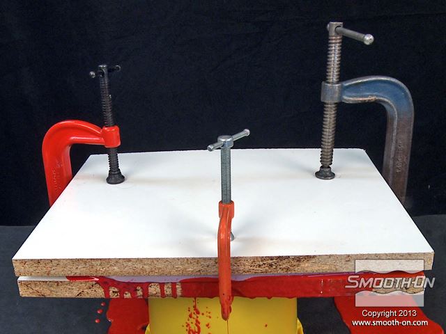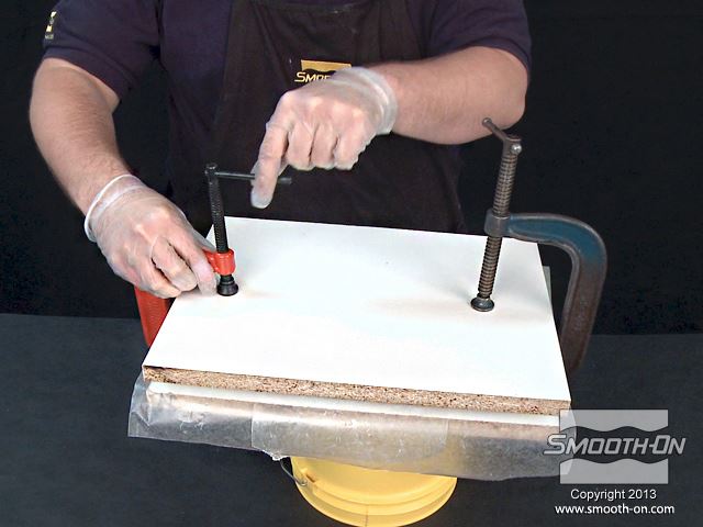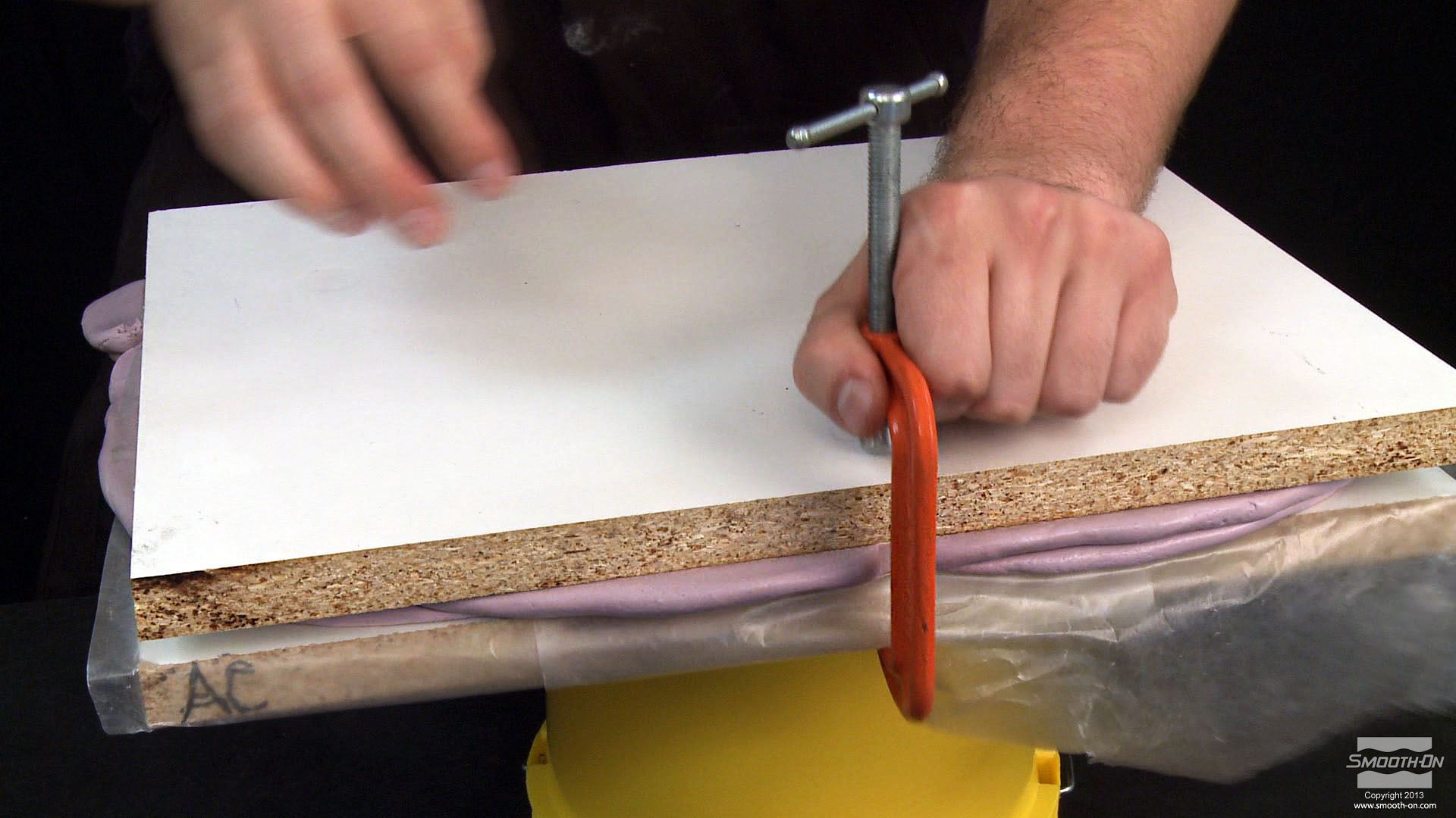 לחיצה להגדלת תמונה מהדקים את המלחציים עד שמגיעים ללחץ אחיד על המשטח. מניחים לתבנית בצק הסיליקון Equinox® 40 להתמצק לגמרי (לפחות 5 שעות). מהדקים את המלחציים עד שמגיעים ללחץ אחיד על המשטח. מניחים לתבנית בצק הסיליקון Equinox® 40 להתמצק לגמרי (לפחות 5 שעות).