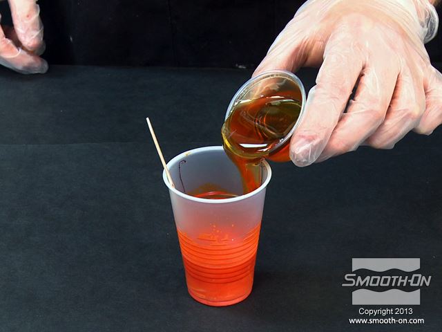 לחיצה להגדלת תמונה מעבירים את המנה השניה של מקשה הפוליאוריתן ליציקה Smooth-Cast® 60D למיכל ערבוב גדול יותר ומוסיפים לו מספר טיפות פיגמנט So-Strong כתום. מעבירים את המנה השניה של מקשה הפוליאוריתן ליציקה Smooth-Cast® 60D למיכל ערבוב גדול יותר ומוסיפים לו מספר טיפות פיגמנט So-Strong כתום.