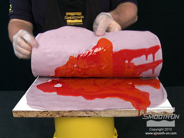 לחיצה להגדלת תמונה מגביהים את לוח הבסיס ותבנית בצק הסיליקון ויוצקים את תערובת הפוליאוריתן Smooth-Cast® 60D לשני חצאי התבנית. מגביהים את לוח הבסיס ותבנית בצק הסיליקון ויוצקים את תערובת הפוליאוריתן Smooth-Cast® 60D לשני חצאי התבנית.