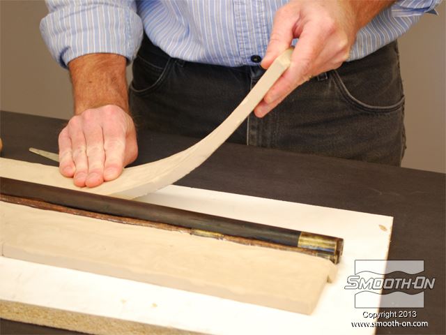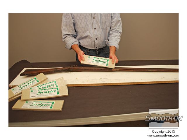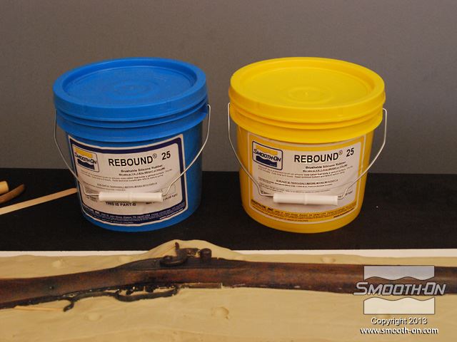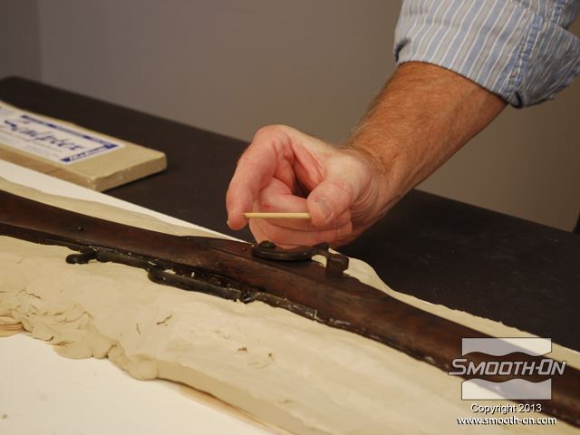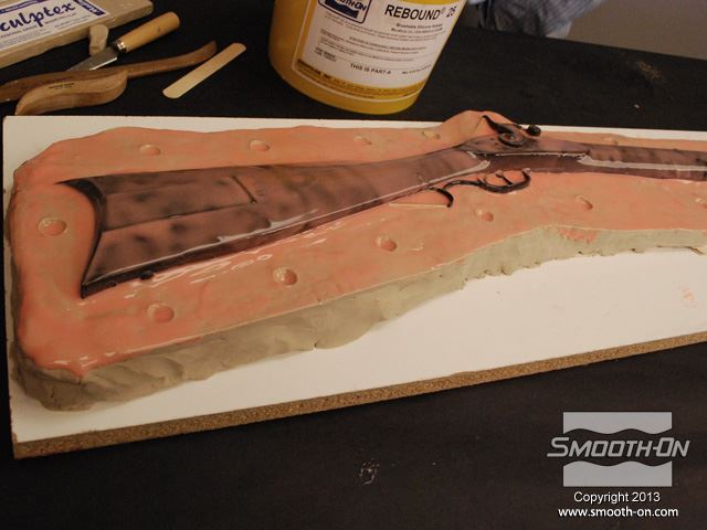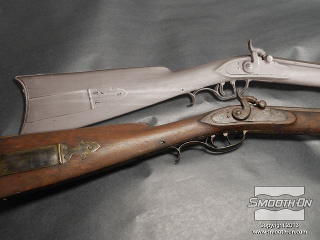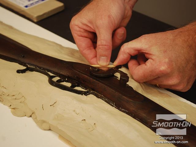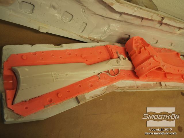 רובה היסטורי מהמאה ה19 משמש בתור המודל להכנת העתק עבור תצוגה במוזיאונים. משתמשים בחימר על בסיס שמן כדי להכין מחיצת הפרדה מסביב לרובה. מניחים את החימר משני צידי הרובה כדי ליצור תבנית משני חצאים . אוטמים את פית הרובה בעזרת אטם קצף כדי למנוע מסיליקון להיכנס (אטם אוזניים פשוט עושה זאת טוב). אטם הקצף לא יפגע בפנים הקנה. הוא מתפשט מעט וכך מונע מהסילקון להיכנס. בעזרת קיסם עץ, יוצרים תעלות אוורור באזורי התבנית שעלולים לכלוא אוויר ביציקה. ממקמים את תעלת האוורור בקצה העליון של הדק הרובה, כדי לאפשר לאוויר לצאת ולשרף לזרום במורד קנה הרובה. יוצרים מפתחות נעילה בתבנית עם מקל ארטיק כדי לאפשר נעילה של שני חצאי התבנית בהמשך. משתמשים בסיליקון RTV להברשה Rebound® 25 כדי להכין את תבנית הגומי. מערבבים את הסיליקון Rebound® 25  ביחס ערבוב 1:1. מערבבים את הRebound® 25 במיכל נקי עד שמתקבל צבע אחיד. מורחים את הסיליקון הRebound® 25 ישירות על הרובה והחימר. לאחר שכל הרובה מכוסה בשכבת סיליקון Rebound® 25, מניחים לסיליקון להתמצק לפני שמורחים שכבה שניה. בשכבות הסיליקון הבאות מוסיפים מסמיך לסיליקון Thi-Vex® כדי ליצור שכבות עבות של סיליקון Rebound® 25  מסמיך לסיליקון -Thi-Vex® מסמיך את הסיליקון ומאפשר בניה של שכבות עבות הנחוצות לחוזק התבנית. מורחים את הסיליקון הסמיך על הרובה והחימר. ממלאים בסיליקון Rebound® 25 תבניות של קוביות קרח על מנת להכין ממלאים שתי תבניות באופן חלקי כדי להכין את ה לאחר שהסיליקון התמצק מוציאים את קוביות הסיליקון מתבנית קוביות הקרח ומניחים אותם על הסיליקון שנמרח קודם לכן על הרובה כשהוא עדיין במצב דביק. מוסיפים עוד סיליקון למריחה בכדי לכסות את הקוביות ולאבטח אותם לתבנית. מוסיפים שכבה סופית של סיליקון, עכשיו ללא מעבה,  על כל אורך התבנית. לאחר שהסיליקון התמצק לחלוטין, משתמשים בחפץ ישר כדי לחתוך את קצוות הסיליקון וליצור תבנית ישרה ויפה. הסכין החד חותך את הסיליקון בקלות ויוצר קצה ישר ונקי. הסכין החד חותך את הסיליקון בקלות ויוצר קצה ישר ונקי. חצי התבנית הראשון, מוכן להכנת החצי הראשון של מעיל התמיכה. כדי להכין מסגרת עבור מעיל התמיכה משתמשים ברצועות קרטון. מדביקים את הקרטון עם דבק חם מסביב לחצי התבנית. כדי להכין תמיכה קלה ועמידה, משתמשים בבצק אפוקסי Free Form® Air. מודדים כמויות שוות לפי נפח של חלקי האפוקסי Free Form®Air. מערבבים את שני חלקי בצק אפוקסי Free Form® Air ביד. משתמשים בלוח לחימר מכוסה בנייר אלומיניום ומארוך, כדי לרדד את האפוקסי לעובי אחיד. מרדדים את בצק האפוקסי על גבי הלוח. מניחים שכבה נוספת של נייר אלומיניום על גבי אפוקסי הFree Form® Air ולאחר מכן מרדדים אותה במארוך. נייר האלומיניום יורד בקלות וחושף שכבה נאה של אפוקסי Free Form® Air. מניחים את האפוקסי על שכבת הסיליקון Rebound ומסירים את שכבת נייר האלומיניום התחתונה מהאפוקסי. חוזרים על פעולה זו עד אשר כל התבנית מכוסה בשכבה אחידה של בצק אפוקסי Free Form® Air. שמים כפפה על היד, טובלים אותה במים ומחליקים בעזרתה את את האפוקסי, כדי לתת מעטפת תמיכה חלקה ונקייה. תוספת המים מאזנת את האפוקסי ומעניקה לו מראה גמור. מניחים לאפוקסי להתמצק במשך לילה ולאחר מכן מסירים את קירות הקרטון. לאחר שמסירים את קירות הקרטון מרימים את המודל מהלוח כדי להתחיל ביצירת החצי השני של התבנית. הופכים את המודל וחושפים את מורידים את החימר מהדגם ומהסיליקון Rebound. לפני התחלת הכנת החצי השני  של תבנית הסיליקון ,יש להסיר את כל שאריות החימר מהמודל. מורחים חומר הפרדה לתבניות סיליקון Ease Release® 205 כדי למנוע מחצי התבנית החדש להדבק לחצי המוכן. במקרה זה משתמשים בEase Release® 205 מכיוון שניתן למרוח אותו בעדינות במברשת מבלי לפגוע ברובה. ניתן למרוח את חומר ההפרדה Ease Release® 205 בקלות בעזרת מברשת. מכינים ומורחים את סיליקון למריחה Rebound באותו אופן שבו הוכן החצי הראשון של התבנית. גם בחצי זה בונים לאחר ששכבות הסיליקון נמרחו, שוב חותכים את הסיליקון ומתקינים את קירות הקרטון מחד