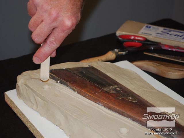 לחיצה להגדלת תמונה בעזרת קיסם עץ, יוצרים תעלות אוורור באזורי התבנית שעלולים לכלוא אוויר ביציקה. בעזרת קיסם עץ, יוצרים תעלות אוורור באזורי התבנית שעלולים לכלוא אוויר ביציקה.