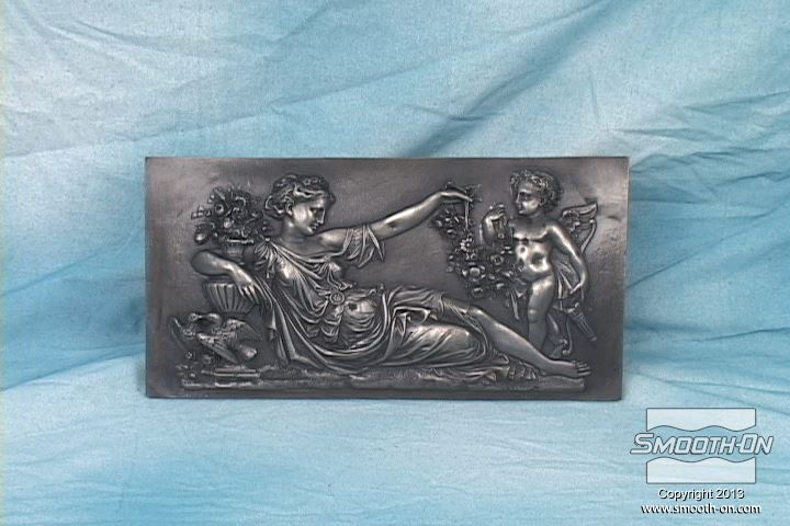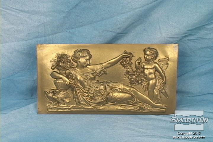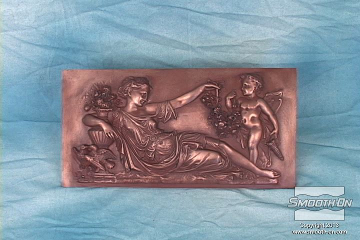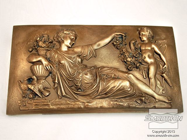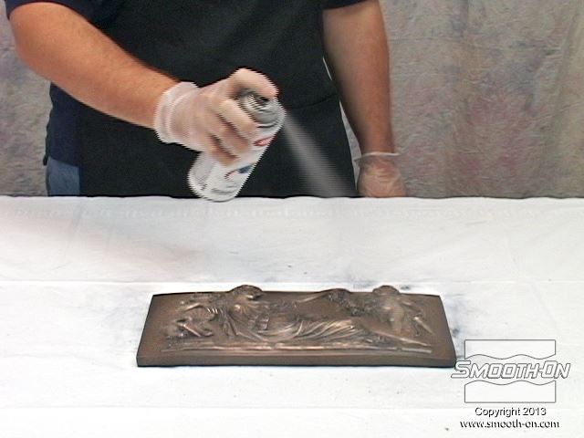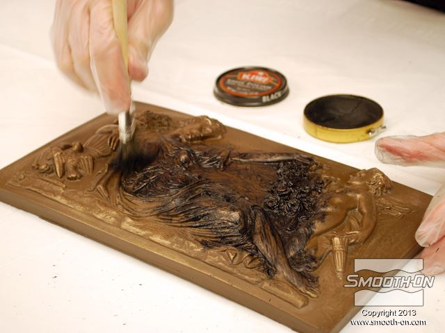 מערבבים את הפוליאוריטן קשיח ליציקה הSmooth-Cast® 325, פיגמנט שחור SO-Strong ואבקת ברונזה כדי להכין דגם הברונזה ב דגם הברונזה ב דגם הברונזה ב מכינים את התבנית עבור חלק זה מסיליקון גומי OOMOO® 30. כדי להבטיח חליצה קלה של היציקה מהתבנית משתמשים בחומר הפרדה לתבנית סיליקון  Ease Release® 200 . שימוש בחומר הפרדה גם מעלה את אורך החיים של תבנית הסיליקון. מרססים שכבה דקה של חומר ההפרדה Mann Ease Release® 200 על התבנית. בעזרת מברשת, מורחים חומר הפרדה בפינות התבנית ולאחר מכן מרססים בפינות עוד שכבה דקה. מנערים ומערבבים את חלק A ואת חלק B לפני שמערבבים ביניהם. מנערים ומערבבים את חלק A ואת חלק B לפני שמערבבים ביניהם. שופכים את הכמות הרצויה של בסיס הSmooth-Cast® 325 אל מיכל ערבוב. שופכים כמות שווה של מקשה הSmooth-Cast® 325 אל המיכל. אבקות המתכת של Smooth-On הן בעובי של -325 mesh (דקות מאוד) ולכן מתערבבות בקלות עם שרף פוליאוריטן ה Smooth-Cast® 325. מכניסים כמות שווה לפי נפח של אבקת ברונזה. כמויות שוות של בסיס A, מקשה B ואבקת הברונזה מוכנות לערבוב. מוסיפים שתי טיפות של פיגמנט שחור למקשה B של הפוליאוריתן. מערבבים את הפיגמנט עם חלק B עד שמתקבל גוון אחיד, לפי שמערבבים אותו עם חלק A. שופכים את הבסיס למיכל ערבוב נקי. מוסיפים את המקשה הצבוע אל הבסיס. מערבבים את הבסיס והמקשה במשך 15 שניות. מפזרים את אבקת הברונזה על השרף ומערבבים את כל הרכיבים במשך 30 שניות. בזמן הערבוב חשוב לגרד את תחתית וצידי המיכל מפעם לפעם כדי למנוע מאבקת המתכת לשקוע ולוודא ערבוב אידיאלי. שופכים את התערובת אל חלל התבנית. מוודאים שלא נותרה אבקת הברונזה בכלי. מיד מתחילים למרוח את החומר בתבנית ויוצרים התערובת תמשיך להתעבות בזמן המריחה. ברגע שהחומר מתחיל להיות דביק Tacky מפסיקים למרוח. בשלב זה, יותר מדי מריחה עלולה לפגוע ביציקה. לאחר שמפסיקים למרוח את הג'לקוט מניחים לו למשך 5-10 דקות כדי שיעבור התמצקות חלקית. חשוב שהחומר לא יתמצק לחלוטין בשלב זה, אחרת עלולה להתרחש דהלמינציה בין הג'לקוט ושכבת מילוי. שכבת המילוי: מודדים כמויות שוות של הבסיס והמקשה של הSmooth-Cast® 325, לפי נפח. שכבת המילוי: מודדים כמויות שוות של הבסיס והמקשה של הSmooth-Cast® 325, לפי נפח. משתמשים בצבע SO-Strong חום כדי ששכבה זו תשתלב עם הבסיס בצבע הברונזה. מוסיפים מספר טיפות של הצבען לחלק B ומערבבים. לפני הערבוב על חלק A, יש לוודא שהצבען וחלק B מעורבבים היטב. שופכים את חלק הבסיס של פוליאוריתן  הSmooth-Cast® 325 למיכל הערבוב. שופכים אל המיכל גם את מקשה הSmooth-Cast® 325 הצבוע. מערבבים את החומרים ביסודיות תוך גירוד צידי המיכל והתחתית מספר פעמים. שופכים את הנוזל אל מרכז התבנית עד שהחלל מתמלא. בשלב זה ניתן להכניס סיכת בטחון מכופפת או חתיכת חוט מתכת כדי ליצור אפשרות לתלייה. ברגע שהחומר יתמצק הדגם כבר יהיה מוכן לתלייה. יש לחכות 60 דקות כדי שהחומר יתמצק כראוי לפני הוצאתו מהתבנית. מוציאים בעדינות את היציקה מהתבנית. שמוציאים את היציקה מהתבנית היא תראה מעט חסרת צבע. כדי להבליט את צבע המתכת יש להבריק אותה כראוי. שלב הגימור: עבור המראה המתכתי הריאליסטי ביותר מומלץ להשתמש בטרפנטין, צמר פלדה ומשחת נעליים. מתחילים בניגוב כל היציקה במטלית ספוגה בטרפנטין. הטרפנטין מרכך במעט את הפלסטיק וגורם לכך שכאשר צבע המתכת מבריק יותר כאשר משפשפים את הדגם בצמר הפלדה. משפשפים את היציקה בעזרת צמר פלדה עד שמגיעים לברק הרצוי. צובעים בעזרת משחת נעליים אזורים להם נירצה לתת אפקט של עומק. מניחים למשחת הנעליים להתייבש ולאחר מכן עוברים עליה עם בד רך ויבש כדי להסיר שאריות. מניחים למשחת הנעליים להתייבש ולאחר מכן עוברים עליה עם בד רך ויבש כדי להסיר שאריות. כדי למנוע מהמתכת להתחמצן ניתן לרסס שכבת הגנה כדי להגן על הגימור. מרססים על היציקה שתי שכבות של ספריי אקריליק חצי מבריק. דגם הברונזה ב