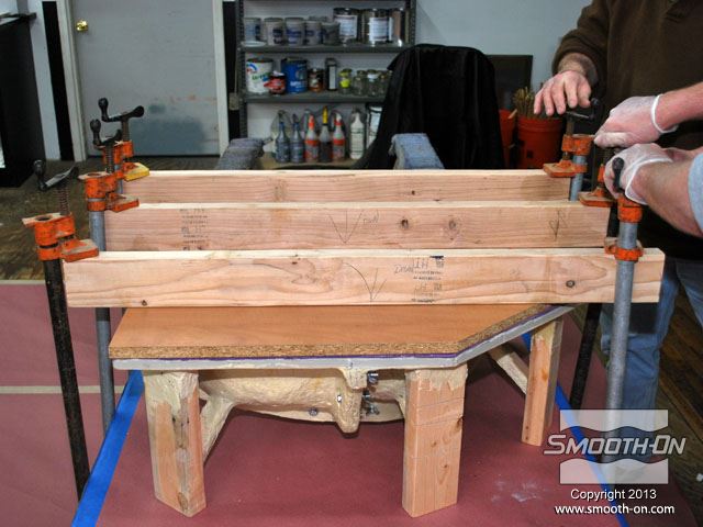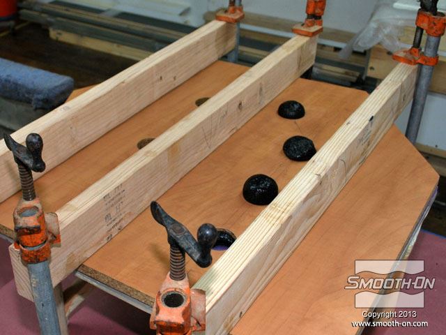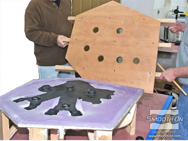 לחיצה להגדלת תמונה מחזיקים את הקרש התומך בעזרת מלחציים. הלחץ הנגדי שהקרש ייצור ישפר את הפרטים על פני השטח של היציקה. מחזיקים את הקרש התומך בעזרת מלחציים. הלחץ הנגדי שהקרש ייצור ישפר את הפרטים על פני השטח של היציקה.