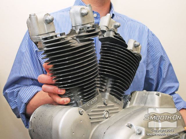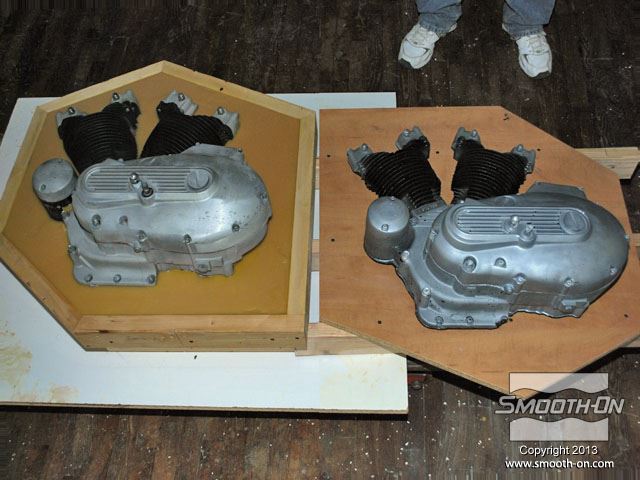 מפזרים פיגמנט באבקה Cast Magic® Silver Bullet במקומות המתאימים על תבנית סיליקון Mold Max 25. מורחים וקס למריחה Sonite® על גבי קרש תמיכה מאוורור. מודדים את חלק הבסיס  של הפוליאוריטן המוקצף והגמיש  Flex Foam-iT!® 17. מודדים את חלק המקשה של פוליאוריטן מוקצף גמיש Flex Foam-iT!® 17. יחס הערבוב של הFlex Foam-iT!® 17 הוא 1A:2B לפי נפח. מוסיפים כמה טיפות של פיגמנט לפוליאוריטן בצבע שחור מסדרת SO-Strong לחלק B. ראשית, מערבבים את הפיגמנט בחלק B של הFlex Foam-iT!® 17. שופכים את חלק B המעורבב עם הפיגמנט למיכל ערבוב גדול. מוסיפים למיכל הערבוב גם את חלק A של הפוליאוריטן המוקצף Flex Foam-iT!® 17 . מערבבים את הקצף בעזרת מקדחה חשמלית בעלת ראש מיקסר טורבינה. שופכים את הקצף המעורבב אל מיכל ערבוב חדש ונקי. מערבבים שוב את הקצף כדי לוודא ערבוב טוב של חלק A וחלק B. שופכים את הפוליאוריתן המוקצף Flex Foam-iT!® 17 אל תבנית הסיליקון. מחזיקים את הקרש התומך בעזרת מלחציים. הלחץ הנגדי שהקרש ייצור ישפר את הפרטים על פני השטח של היציקה. לאחר מספר דקות, פוליאוריתן מוקצף גמיש מתחיל לצאת דרך חורי קרש התמיכה. זמן ההתמצקות של הפוליאוריטן מוקצף Flex Foam-iT!® 17 הוא 2 שעות. בזמן זה חותכים את החומר היצא בעזרת סכין חד. קרש התמיכה נמרח קודם לכן ב וקס למריחה ולכן יורד בקלות רבה מיציקת הקצף. מקלפים את תבנית הסיליקון מעל יציקת הקצף. בתמונה, יציקת קצף פוליאוריתן Flex Foam-iT!® 17 (צד ימין) והמנוע המקורי (צד שמאל) נראים כמעט זהים. יציקת פוליאוריתן מFlex Foam-iT!® 17 הינה קלה והעתיקה את פרטי המודל באופן מושלם. החוזק והגמישות של פוליאוריתן מוקצף Flex Foam-iT!® 17 מעניקה למנוע המועתק עמידות בקריעה ובבלאי.