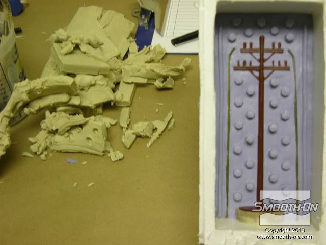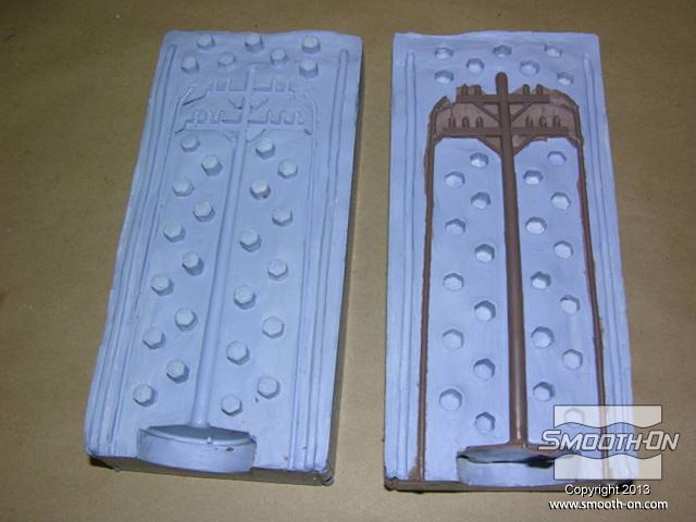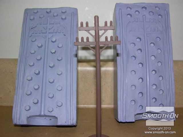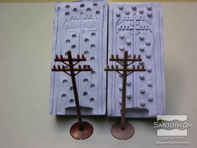 מטביעים עמוד טלפון מיניאטורי (עד לאמצע שלו) בתוך חימר נטול גופרית LBT/NSP  (בתוך קופסת תבנית). יוצרים בחימר חורים שישמשו לנעילת התבנית, בעזרת עט. שופכים לתבנית סיליקון ליציקה OOMOO® 30 (לאחר ערבוב), כדי להכין את חצי התבנית הראשון. נותנים לסיליקון OOMOO® 30 להתמצק במשך 6 שעות הופכים את התבנית כך שהחימר פונה למעלה. מוציאים את החימר מהקופסה וחושפים את החצי השני של מודל עמוד הטלפון. מנקים את כל החימר מהמודל וחצי תבנית הסיליקון. מרססים חומר הפרדה לסיליקון  Ease Release® 200 על משטח הסיליקון החשוף. ספריי הפרדה לסיליקון  Ease Release® 200 דואג שהסיליקון הנוזלי לא ידבק לסיליקון המוצק. מערבבים סיליקון OOMOO® 30 ושופכים אל תוך הקופסה כדי ליצור את חצי התבנית השני. מניחים לחצי התבנית השני להתמצק. לאחר מכן, פותחים את שני חצאי התבנית ומוציאים את עמוד הטלפון המיניאטורי. מצפים את התבנית באבקת טאלק כדי להעניק ליציקה גימור מט. עבור היציקה, משתמשים בשרף פוליאורטן Smooth-Cast® 320. מודדים את החלקים בכמויות שוות. מוסיפים לחלק המקשה פיגמנט לפוליאוריטן SO-Strong חום. מערבבים את הפיגמנט ביסודיות בחלק המקשה של שרף הSmooth-Cast® 320. שופכים את חלק הבסיס עם חלק המקשה הצבוע של פוליאוריטן קשיח ליציקה Smooth-Cast® 320. מערבבים את הבסיס והמקשה במשך 90 שניות. שואבים את פוליאוריתן הSmooth-Cast® 320 ממיכל הערבוב בעזרת מזרק. מזריקים את שרף הSmooth-Cast® 320, בעל הצמיגות הנמוכה, אל התבנית. ה פוליאוריטן ליציקה ממלא את תעלות האוורור בצידי התבנית וכך מובטחת יציקה ללא בועות אוויר. מניחים לפוליאוריתן הSmooth-Cast® 320 להתמצק לחלוטין. חותכים פלאשים מהיציקה בעזרת סכין מדוייק. יציקת הפוליאוריתן Smooth-Cast® 320 העתיקה באופן מדוייק את תבנית הסיליקון. ניתן להכין יציקות רבות מתבנית סיליקון OOMOO אחת. הכנת תבנית ויציקה בשיטה זו מאפשרת שכפול כל מודל מקורי. ניתן להכין כל חלק נוף בכל גודל בעזרת תבניות הסיליקון  ויציקת שרפי הפוליאוריתן של של Smooth-On. היציקות מעתיקות את פרטי תבנית הסיליקון באופן מושלם. ניתן להוסיף צבעים ל יציקות פוליאוריטן הSmooth-Cast® לקבלת מגוון אפקטים עצום! אפשר גם ליצוק מתכות בעלות טמפ' התכה נמוכה לתבניות סיליקון OOMOO. בתמונה, יציקת בית עבור נוף לרכבות מיניאטוריות משרף פוליאוריתן Smooth-Cast® 300. בתמונה, יציקת שרף TASK® 4 . פוליאוריתן זה מיועד במיוחד עבור יציקות בלתי שבירות, בעלות עובי דופן דק מאוד. ניתן להכין מודלים מפורטים ביותר ע