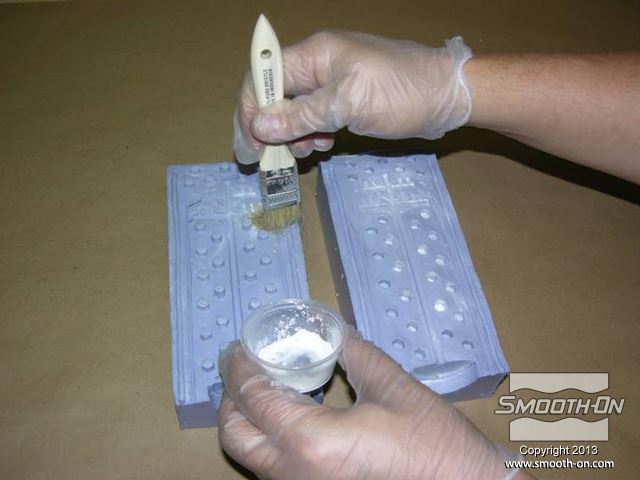 לחיצה להגדלת תמונה מצפים את התבנית באבקת טאלק כדי להעניק ליציקה גימור מט. מצפים את התבנית באבקת טאלק כדי להעניק ליציקה גימור מט.
