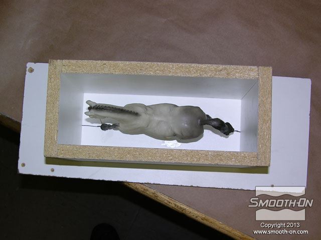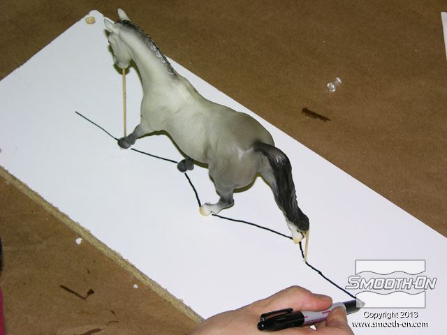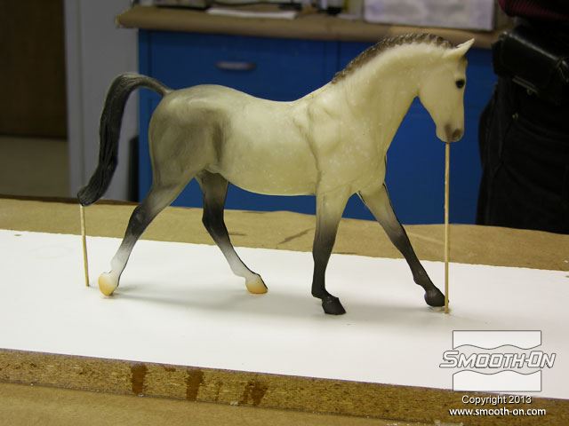 לחיצה להגדלת תמונה בעזרת דבק חם, מייצבים את הסוס על גבי לוח הבסיס. כדי למנוע לכידה של בועות אוויר בזמן היציקה, יוצרים תעלות אוורור במקומות אסטרטגיים על המודל. במקרה זה, קיסמי עץ מודבקים אל המודל בקצה הזנב ובראש. בעזרת דבק חם, מייצבים את הסוס על גבי לוח הבסיס. כדי למנוע לכידה של בועות אוויר בזמן היציקה, יוצרים תעלות אוורור במקומות אסטרטגיים על המודל. במקרה זה, קיסמי עץ מודבקים אל המודל בקצה הזנב ובראש.
