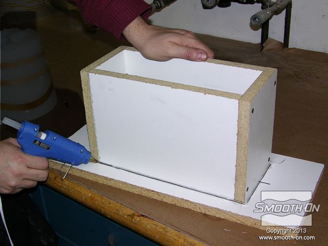 לחיצה להגדלת תמונה מדביקים את קופסת התבנית ללוח העץ בעזרת דבק חם. כך גם אוטמים את הקופסה לדליפה של גומי. מדביקים את קופסת התבנית ללוח העץ בעזרת דבק חם. כך גם אוטמים את הקופסה לדליפה של גומי.