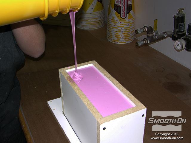 לחיצה להגדלת תמונה שופכים לאט את סיליקון גמיש ליציקה Mold Max® 30 אל הנקודה הנמוכה בקופסת התבנית ומניחים לחומר לעלות בעצמו על המודל (בניגוד ללשפוך ישירות על המודל). שופכים לאט את סיליקון גמיש ליציקה Mold Max® 30 אל הנקודה הנמוכה בקופסת התבנית ומניחים לחומר לעלות בעצמו על המודל (בניגוד ללשפוך ישירות על המודל).